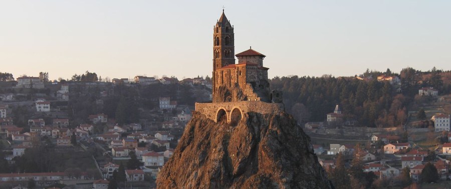 Tra questi altari innalzati come ad una divinità, tra queste chiese “alte” dedicate a san Michele, la più spettacolare forse è la chiesa di Saint-Michel-d’Aiguilhe, posta come una torcia accesa sulla stretta cima di un picco vulcanico a Le Puy, nel Velay. Edificata prima del Mille, e riadattata nell’XI secolo, la si raggiunge salendo i 268 gradini scavati nel tufo sul fianco del colle; in cima, la piccola spettacolare chiesetta – pochi metri quadrati, di forma irregolare, con colonne e capitelli all’interno, e bellissimi affreschi romanici – è affiancata dal campanile, la cui guglia si protende ancor più verso il cielo.
