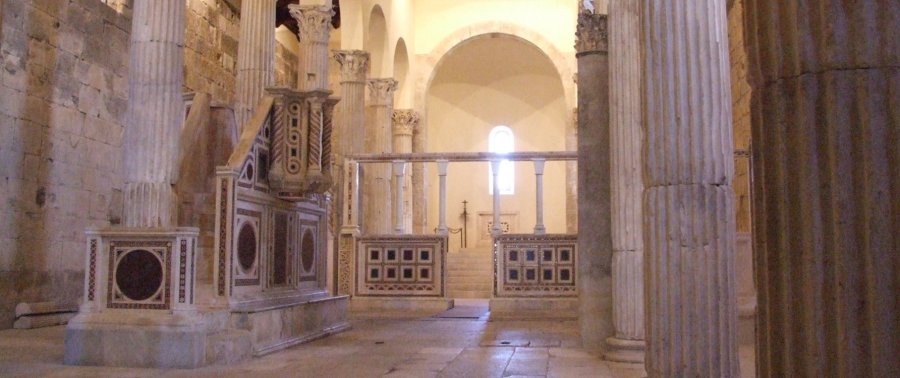 Come in molti altri casi, ad Alba Fucens la metamorfosi da tempio a chiesa data ai primi secoli dell’era cristiana; ma qui tutto sembra ancora in corso, in un lentissimo progredire, tanto dolce ed elegante si presenta questo interno ai suoi visitatori. E in questa raffinata spazialità giocano un ruolo decisivo gli arredi cosmateschi, un mirabile ambone e un’elegante iconostasi. Rivestiti di mosaici e marmi, dove predomina il rosso, accompagnato da un blu intenso e bordato dal luccichio dell’oro, si stagliano a loro agio, dialogando con le colonne antiche in perfetta corrispondenza; ma allo stesso tempo, interrompendo il lineare procedere dei colonnati, innestano nella navata il gusto romanico della complessità ed introducono quell’attitudine, di nuovo romanica, a disegnare spazi compositi più che lineari. E se San Pietro in Albe non è più solo “classica” e non è più solo paleocristiana, è proprio per la presenza, nel cuore della navata, di questi elementi d’arredo così belli e così… medievali.