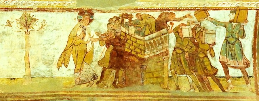 Per questa scena in particolare, la chiesa di Saint-Savin sur Gartempe guadagna un posto di primo piano nella storia dell’arte romanica: mentre racconta devota le storie antiche della Bibbia, la sua lunga volta affrescata scatta anche un’istantanea a se stessa; ritrae e tramanda, così, in questo singolo preziosissimo affresco, il lavoro coraggioso e incessante che servì per costruire quest’abbazia, e tutte le altre che il tempo romanico seppe edificare, pietra dopo pietra, puntando ad arrivare in alto, infine anche più in alto dell’altissima volta della stessa Saint-Savin.