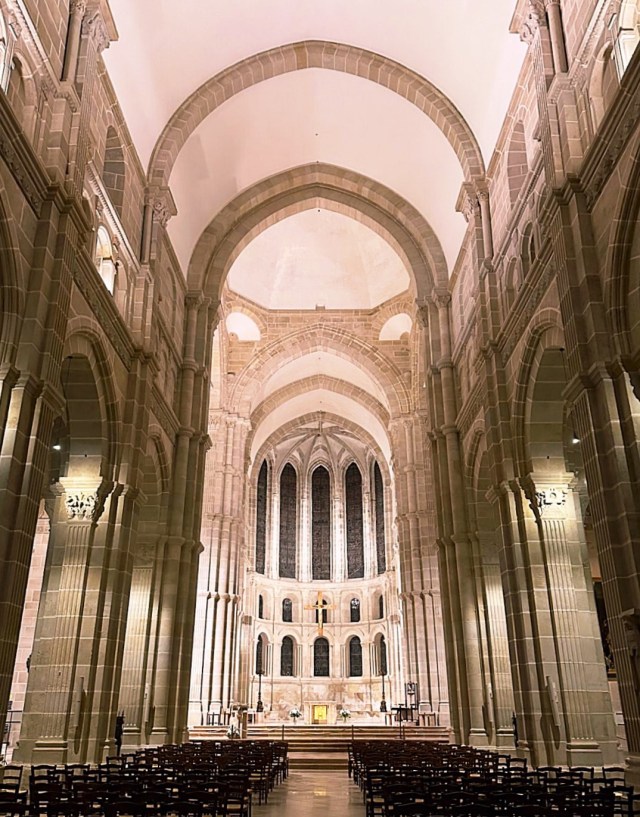 E’ forse messo in ombra dalla sfolgorante bellezza del portale d’ingresso, ma l’interno possente della chiesa di Saint-Lazare, ad Autun, ha la forza propria delle opere inconfondibili. Certo: la grande lunetta del Giudizio universale, sopra la porta di accesso, incanta i visitatori della chiesa, e molti ne percorrono la navata cercando con ansia i capitelli scolpiti, per emozionarsi di nuovo davanti all’opera dello scalpello di Gislebertus; ma chi un poco si appassiona anche ai miracoli dell’architettura può e deve fermarsi al centro della navata, per osservare il mirabile impianto, e per ascoltarne il respiro, fatto di pause e spigoli, di curve e di rette che stanno in sorprendente equilibrio.