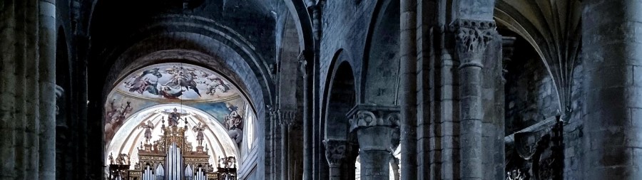Questa ricchissima cittadina d’Aragona, con i suoi capitelli, non finisce di sorprendere. Sta tra queste case di pietra e legno lo scandaloso “capitello del satiro”, tra i più spettacolari di tutto il medioevo; e nella cattedrale, nei portali, nella loggia che ripara l’ingresso laterale alla chiesa, il “Maestro di Jaca” – che poco dopo si trasferirà a Fromista – regala pezzi di chiarissima ispirazione classica: il re Davide che guida il concerto, l’Abramo fermato mentre sta per sacrificare Isacco, il profeta Balaam con la sua asina e altri capitelli di grande livello si contendono il titolo di miglior pezzo scolpito da questa mano inconfondibile; ma la “mujer semidesnuda que con sus encantos y la música trata de seducir al hombre” fa un’altra corsa, e gareggia con altre contendenti per la palma che spetta al più affascinante corpo femminile del tempo romanico.