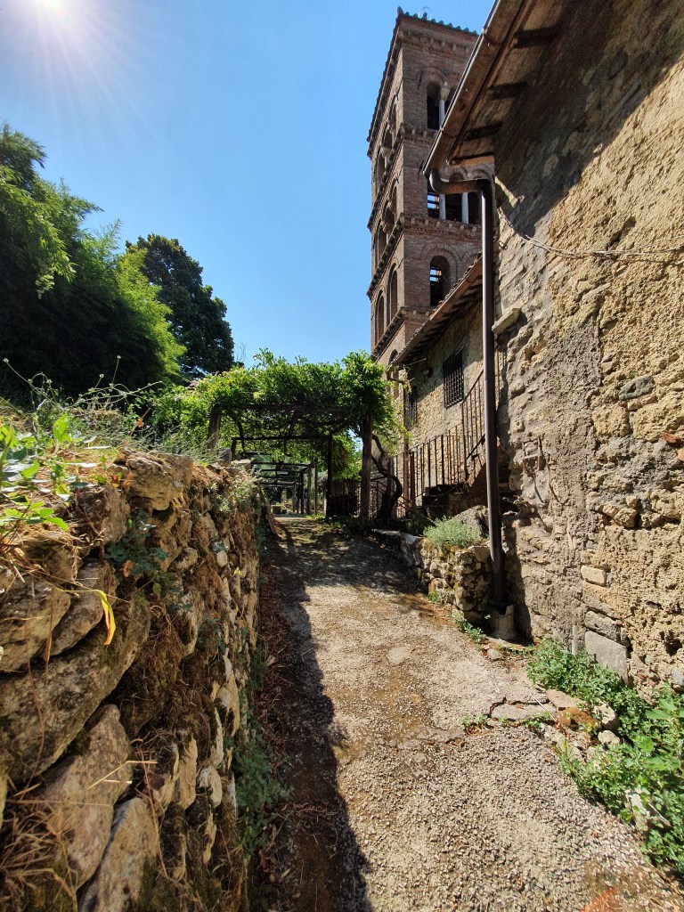 Comunque, la vista della basilica avvolta in questo rigoglio di basse sterpaglie tipicamente romane – che addirittura, circondandola, la fanno sembrare piccola, mentre la sua mole è di tutto rispetto – è uno spettacolo a cui non si può rinunciare. Anzi: pochi luoghi avrai trovato accoglienti come l’angolo di mondo che si distende lungo il fianco sinistro della chiesa: sotto la parete in bella muratura, che dal campanile in facciata va fino alle absidi, e all’ombra di queste, qualcuno ha messo un tavolaccio di marmo grezzo, e panche, squassate, sotto una tettoia incerta e fatta di poche assi coperte da un rampicante; ma che meraviglia questi pochi metri dedicati all’uomo, se non a Dio, ricavati tra la chiesa e i cespugli che, da sopra un muretto, minacciano la basilica e insieme la proteggono dal mondo esterno, che senti lontanissimo… Da una bocca antica – qui tutto sembra vecchio di secoli, anche i pochi grappoli d’uva, anche il tubo utilizzato per innaffiare – zampilla un’acqua fresca e limpida, e non serve null’altro.