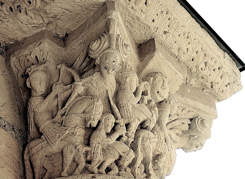 “Quando l’Agnello sciolse il primo dei sette sigilli – recita il testo – vidi e udii il primo dei quattro esseri viventi che gridava come con voce di tuono: «Vieni». Ed ecco mi apparve un cavallo bianco e colui che lo cavalcava aveva un arco, gli fu data una corona e poi egli uscì vittorioso per vincere ancora”. E’ Giovanni, che parla. E così come la visione dell’Apocalisse mostra per primo un cavaliere armato d’arco, così il capitello di Saint-Benoît dedica la sua prima “faccia” a questa figura, mettendo il campo il primo dei “flagelli” destinati a percorrere la terra, e poi prosegue fedelmente, via via, con gli altri tre emissari di morte. Percorrendo il capitello verso destra, vediamo infatti un secondo cavaliere, che brandisce una spada, lo stesso che incontriamo proseguendo nella lettura dell’Apocalisse, che dice: “Quando l’Agnello aprì il secondo sigillo, udii il secondo essere vivente che gridava: «Vieni». Allora uscì un altro cavallo, rosso fuoco. A colui che lo cavalcava fu dato potere di togliere la pace dalla terra perché si sgozzassero a vicenda e gli fu consegnata una grande spada”. Anche la guerra è scesa nel mondo, per seminare di sé i campi e le città.