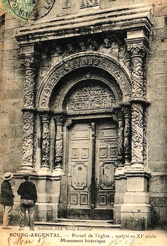 Tra quelle che ricordo, almeno quattro altre foto storiche, per tornare al punto di partenza, meritano di stare al fianco di quella scattata ad Ely molti decenni fa, e di esse Before Chartres ha già scritto qualcosa, per chi volesse proseguire il viaggio. La prima ritrae un nobiluomo intento ad osservare il “portale della caccia” di Bourges; nella seconda, un anziano cittadino di Tolosa si riposa all’ombra seduto a pochi passi dalla “Porte Miègeville”, sul fianco della basilica di Saint-Sernin; nella terza, a guardarsi a vicenda sono il portale “eretico” della chiesa di Espalion e Arthur Kingsley Porter, uno degli studiosi che meglio l’ha saputo osservare; nella quarta, una cartolina “storica” due francesi si guardano, da sotto in su, il bel portale di Bourg-Argental… Chi ne ricordasse altre e avesse voglia di segnalarle, trova questo blog in fiduciosa attesa.