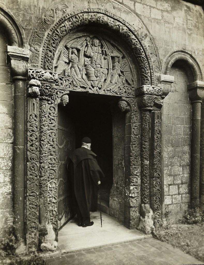 Tra queste foto un po’ consunte, ma sempre vive perché fissano e rappresentano il rapporto intenso che si crea tra i capolavori romanici e l’animo umano che li incontra, una delle più belle ritrae la “Porta del Priore” della cattedrale di Ely, nel momento in cui un monaco, come avrà fatto infinite volte nella vita, ne spalanca lentamente il portone e la attraversa per entrare in chiesa.