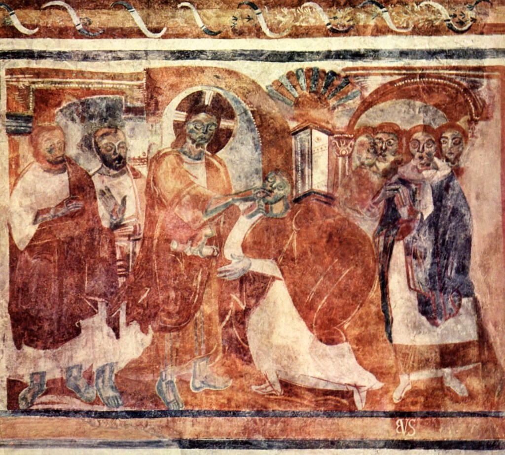 Occorre salire sulla tribuna dell’organo costruita in epoca moderna sulla controfacciata, di fronte alle tre grandi absidi; è qui che, nella parte alta della parete sinistra della chiesa, si può osservare da vicino – grazie appunto alla parte soppalcata – il miracolo operato da Gesù a Sidone, così com’è rappresentato da questo artista del IX secolo. Che indugia sulla destra del Signore che sfiora le labbra dell’uomo; che però aggiunge, a toccare le stesse labbra, l’indice del sordomuto; e riesce a rappresentare così quello che è il sentimento prevalente di tutto il brano evangelico, cioè lo stupore di fronte alla potenza miracolosa della volontà del Cristo.