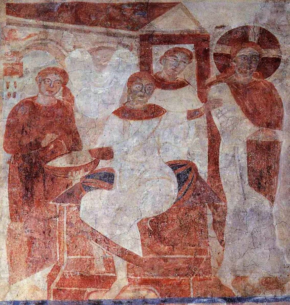 Decisamente moderna – su questo non sussiste dubbio alcuno – è la resa grafica di questo episodio, certamente il più riuscito tra quelli che ci rimangono. Basta, a dimostrarlo, la forza espressiva e la maestria con cui sono rappresentate le mani, ed anche i piedi, dei personaggi sulla scena, vere e proprie prove d’anatomia applicata al disegno. Basta la forza dei volti, contemporaneamente espressivi, realistici e onirici, come un “Urlo di Munch” ante litteram; e si noti con quanta sapienza con la sola leggera inclinazione del capo l’artista ci mostra lo stupore dei discepoli sulla sinistra… Basta, a ribadire il tanto di nuovo che sta in questi affreschi antichi, realizzati cent’anni prima di quelli di Reichenau, e due secoli prima di quelli di Sant’Angelo in Formis, il modo in cui sotto l’arco a destra nel riquadro – e lo stesso accade in altri pannelli dello stesso tipo – la muratura si rappresenta con un taglio prospettico che davvero sorprende, e che nessuno direbbe dipinto, sull’intonaco fresco, negli anni lontanissimi in cui, ancora, la piccola e fedele Europa si diceva carolingia, oltre che cristiana.
