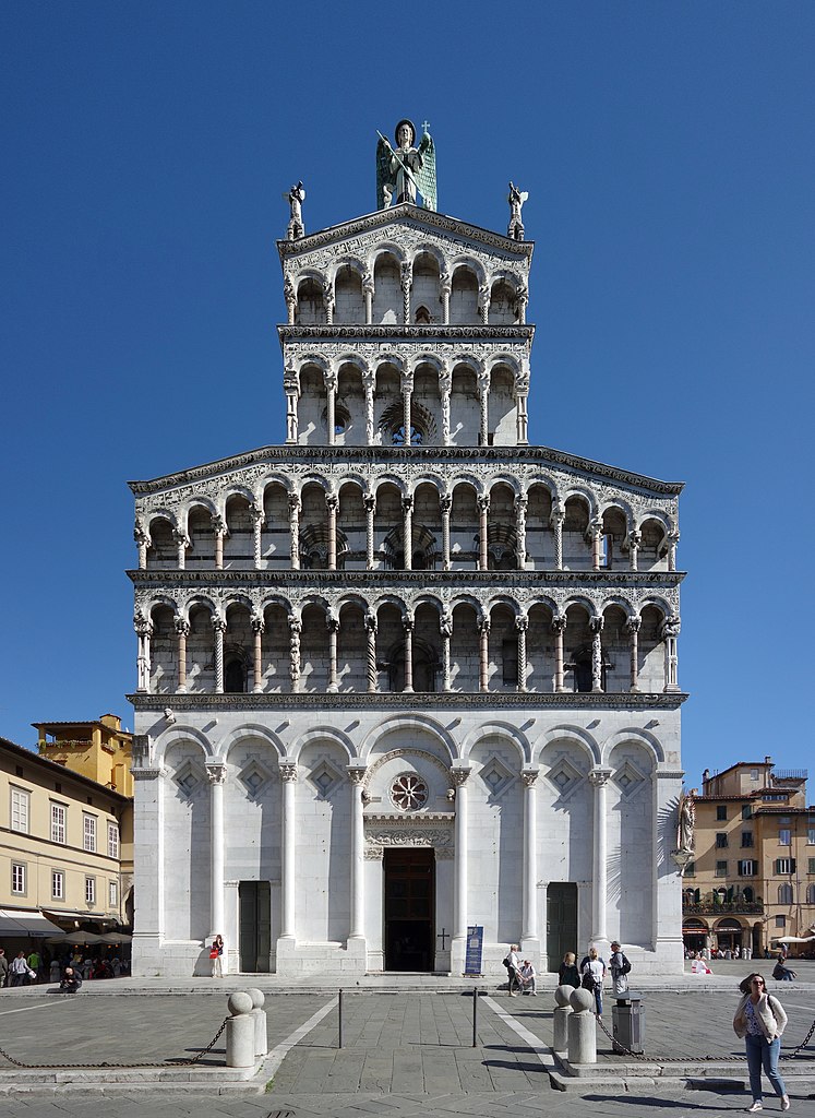 Le chiese lucchesi (San Martino, San Michele in foro, ma anche Santa Maria forisportam, quest’ultima molto simile al duomo pisano anche nell’interno) anche loro seguono sempre il numero di pari di loggette, con la colonnina al centro, ma sempre in numero di 6.
