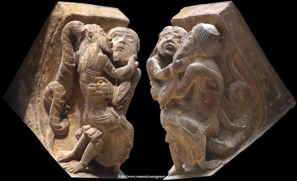 Tra tutte le scene “laiche” di Uncastillo, questa è certamente la più appassionante. E però, mentre sembra regalarci un messaggio scanzonato – due secoli più tardi il Boccaccio parlerà con questo stesso linguaggio – lo scultore che in questa scena ha certamente narrato le proprie pulsioni, mettendo nella pietra i suoi desideri più intensi, ci racconta anche i tabù e i timori di uomo del XII secolo. Perché i due amanti del canecillo non sono soli, e la libera espressione della loro libido non è affatto il centro del messaggio. Al contrario, come bene evidenzia Garcìa Omedes nel suo blog romanicoaragones.com, due serpenti affiancano gli amanti, e contrassegnano con la loro presenza l’abbraccio tra i due, e ne stravolgono il significato, da godimento a peccato: il primo serpente, a sinistra, si stende dietro al corpo della fanciulla, e come un astuto suggeritore soffia al suo orecchio ogni più seducente pensiero ed ogni più seducente movenza; l’altro discende invece lungo la schiena dell’uomo – ora ci accorgiamo, dalla tonsura, che si tratta di un monaco – fino ad infilarsi là dove può mordergli i genitali.