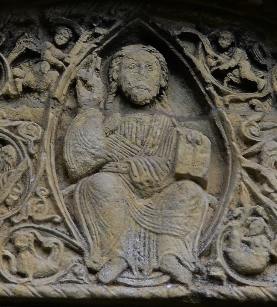 Dal punto di vista dell’impaginazione, la più evidente di queste invasioni è il fiorire di girali vegetali che, di solito confinati nell’architrave e negli archivolti di un portale, si diffondono qui invece in tutta la lunetta. Il gioco dei cerchi realizzati con rami e foglie, così caratteristico in tutto il romanico, a Barfreston riempie quello spazio semicircolare che normalmente è proprietà privata del Salvatore e della sua corte. Qui, al centro della lunetta, il Cristo in Gloria resiste, difende la sua “mandorla”; ma non trovano più spazio intorno a lui i simboli dei Viventi; e gli stessi angeli che hanno il compito di reggere la cornice della gloria del Salvatore a fatica si ricavano uno posto dove stare; ma in alto, e costretti comunque ad adattarsi alla piccola prigione circolare di uno di quei viticci tondi che tutta hanno invasa la lunetta a destra e a sinistra dell’Onnipotente.