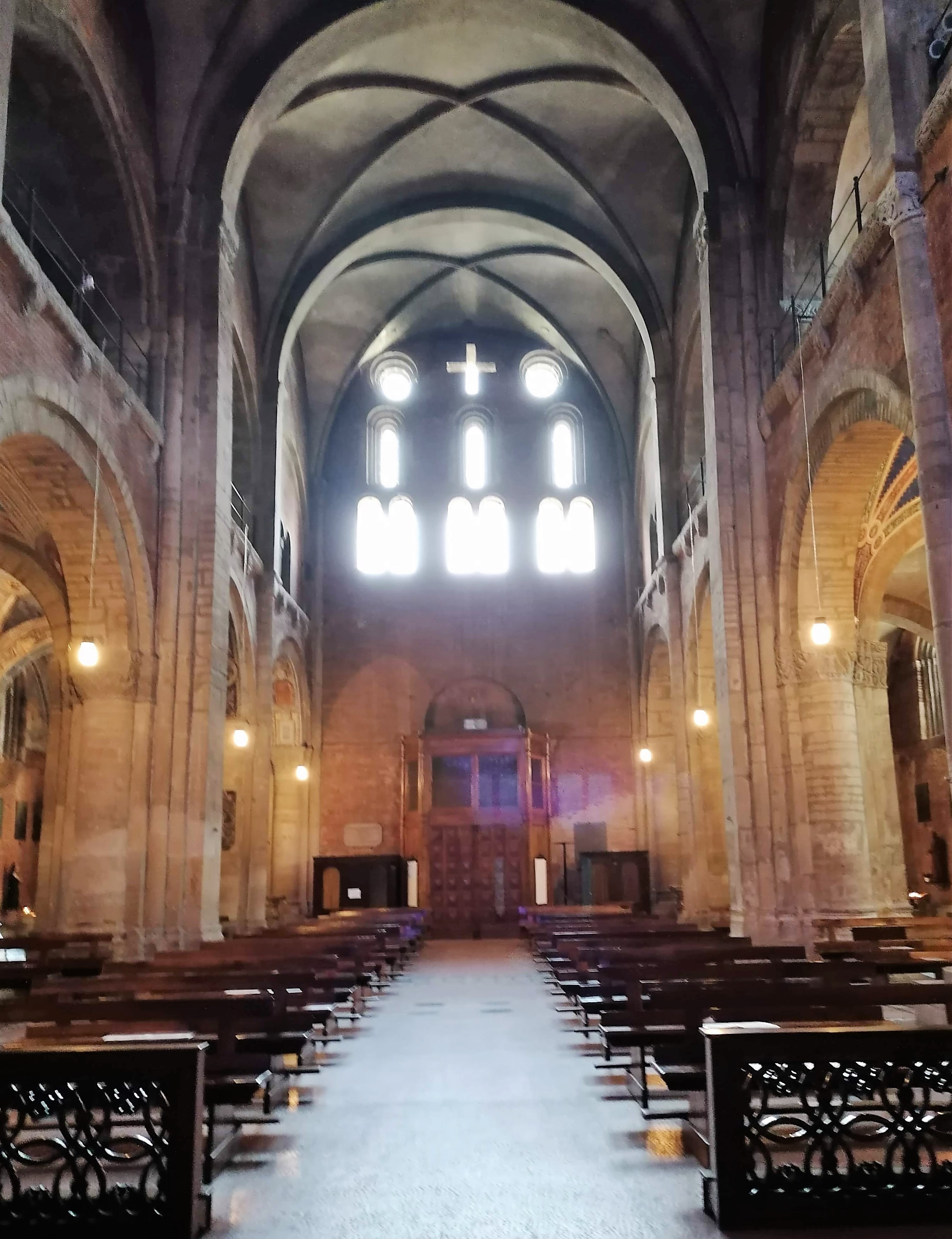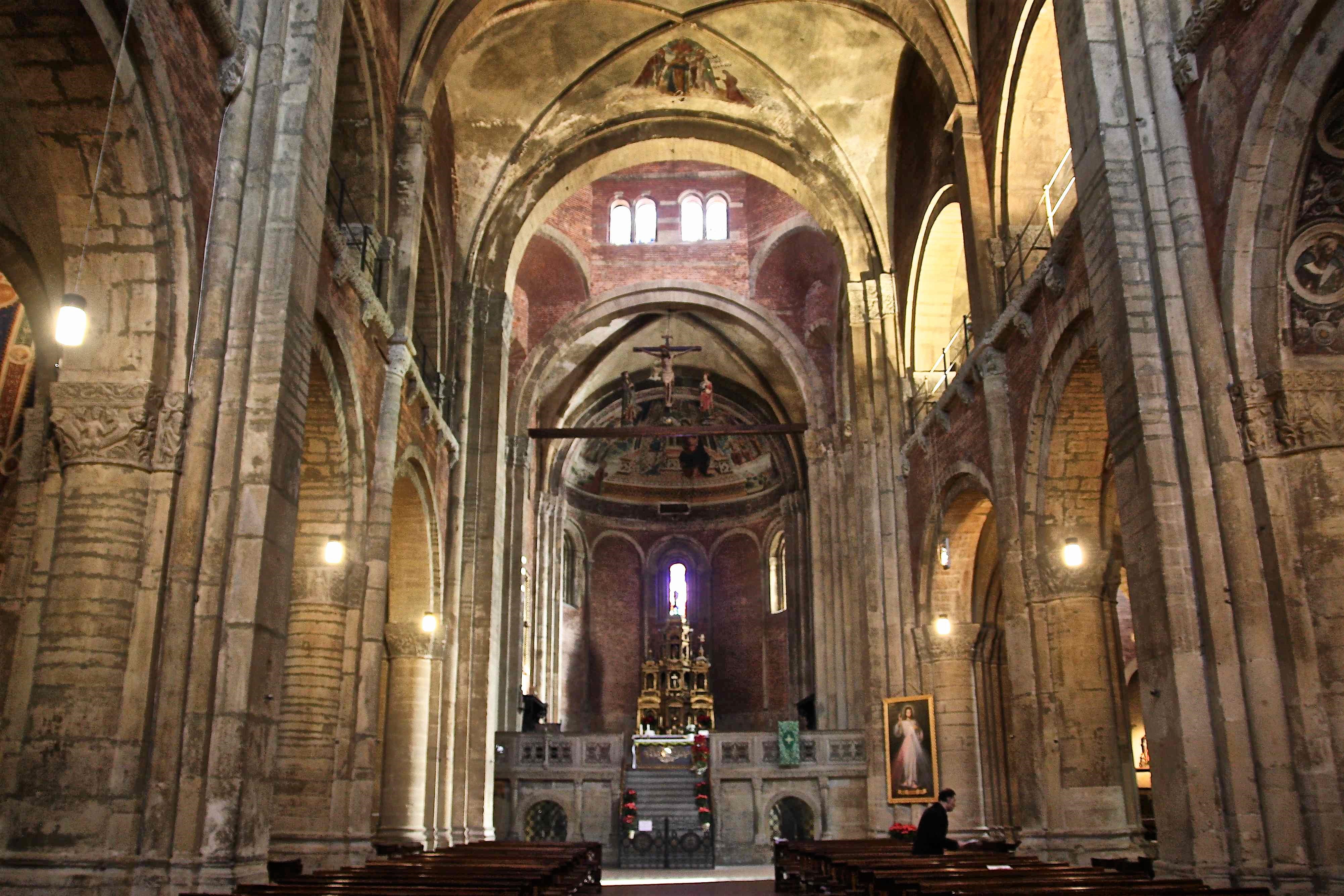 Molto in San Michele fa pensare a questa funzione “incoronante” della chiesa, e in primo luogo la sua austera e possente struttura. Non lunga, e però proporzionata, dotata di un ampio transetto, la nuova chiesa concentrava nella sua parte centrale – quasi come un edificio a croce greca – l’attenzione e l’azione; i massicci pilastri complessi, alternati tra forti e deboli, portavano il peso di una copertura tutta in pietra: le navatelle, voltate a crociera, sostenevano i matronei, mentre la navata centrale era coperta da due grandi campate a crociera – quelle attuali, rettangolari, sono del XIV secolo -; una cupola fu eretta sull’incrocio tra la navata e il transetto, questo voltato a botte.