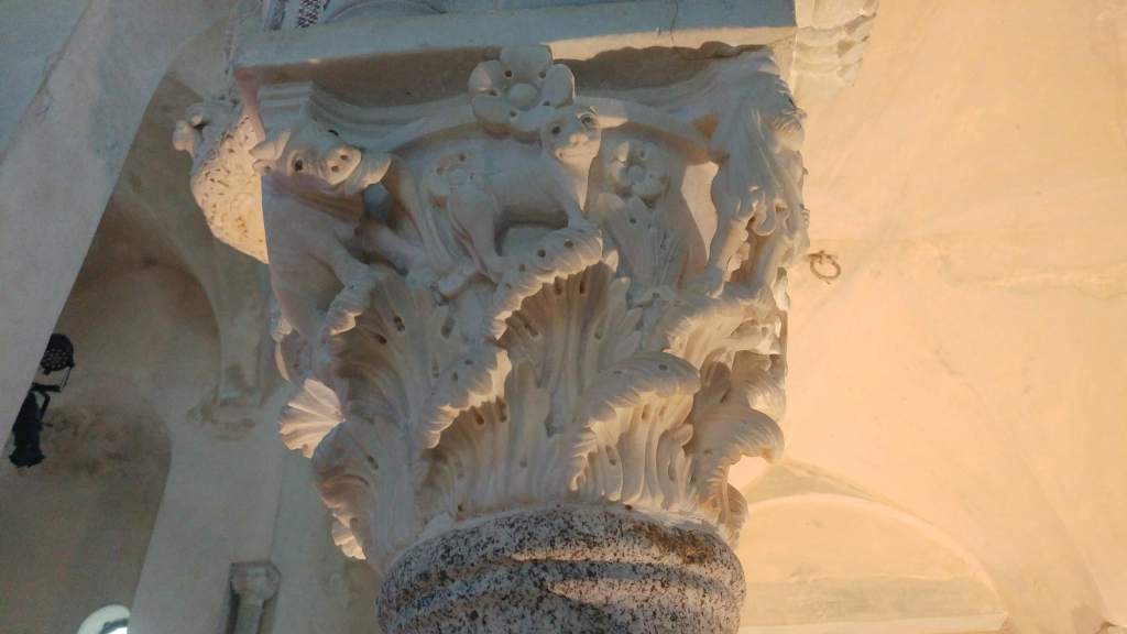 Poco tempo fa avevo ritrovato in un libro, nel volume dedicato alla Campania nella collana romanica di Jaca Book, qualche pagina dedicata a quella chiesa e a quel pulpito. E con grande sorpresa mi era sembrato di riconoscere, nell’unica foto a corredo, proprio quel capitello incantato: “Una menzione a parte – scrive Valentino Pace, riferendosi proprio al rilievo che avevo a lungo inseguito – merita almeno uno dei due capitelli composti, quello vicino alla colonna, che, per le sue elegantissime forme, segna un grado di mimesi classicista…”. Non ero certo che si trattasse del capolavoro che cercavo: nella foto pubblicata a piena pagina, tra le foglie d’acanto inclinate e aperte spuntavano un uomo nudo e barbuto e una civetta con la preda nel becco, entrambi con pietre scure a far da pupille; e poi però mi è parso di riconoscere, all’angolo, le terga del toro che cercavo da tanti anni.