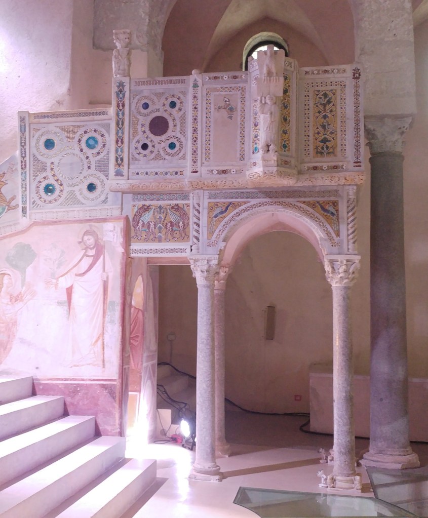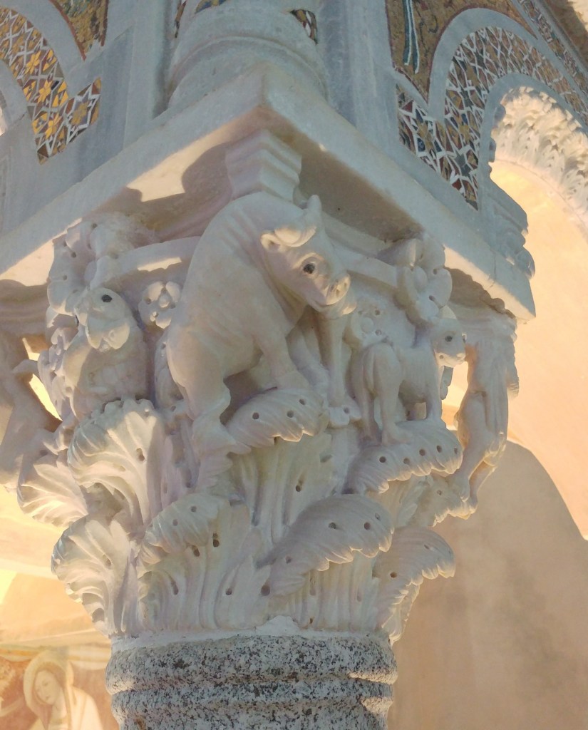 Davvero non so perché quel giorno avevo deciso, mentre il gruppo visitava una grande villa affacciata sul mare, di arrivare da solo fino alla chiesa di San Giovanni del Toro; ricordo un interno spoglio e diafano; ricordo un ambone sostenuto da quattro colonne… E ricordo che di fronte ad uno dei capitelli, uno in particolare, ho pensato che raramente ne avevo visti di più dolci, di più eleganti, di più delicati e vivi. Mi aveva colpito in particolare quel toro posto ad un angolo del capitello. E ciò che meglio ricordavo, o pensavo di ricordare, è che negli occhi aveva, incastonate, delle piccole gemme scure.