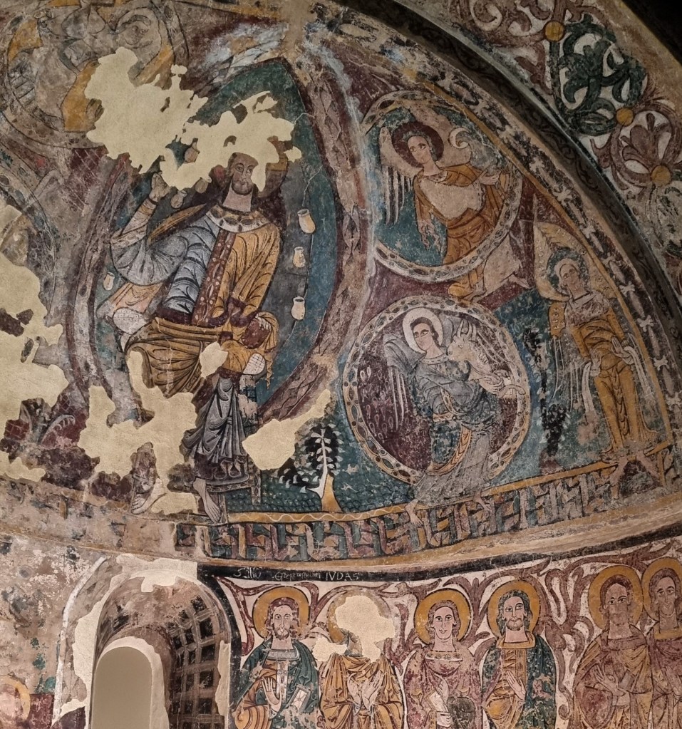 Jaca è una citta strepitosa per chi ama l’arte romanica: famosa per i suoi capitelli – citiamo almeno il capitello “del satiro” e quello del concerto di Re David, di cui Before Chartres ha già raccontato le storie affascinanti – ospita nel suo Museo diocesano anche altre opere di grande valore: quanto alla pittura, famosissimi sono gli affreschi di Bagues, qui trasferiti nel secolo scorso, proprio con lo stesso intento di conservazione che ha fatto portare qui i dipinti dell’abside di Ruesta. Una presentazione chiara dei contenuti romanici del Museo si trova nell’interessantissimo sito Arteguias, nella pagina ad esso dedicata. Alcune delle foto di questo post sono invece prese dalla pagina sull’abside di Ruesta nel sito patrimoniodehuesca.com.