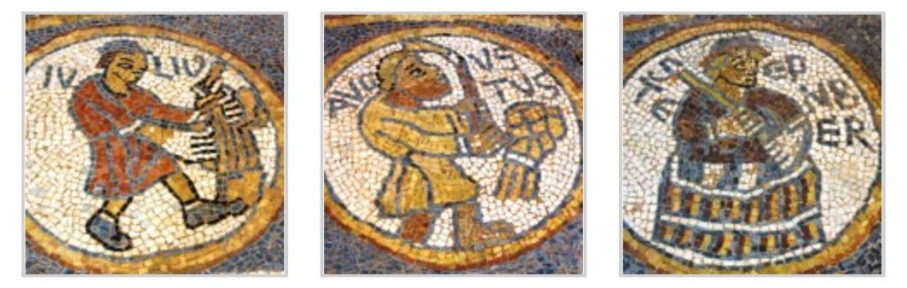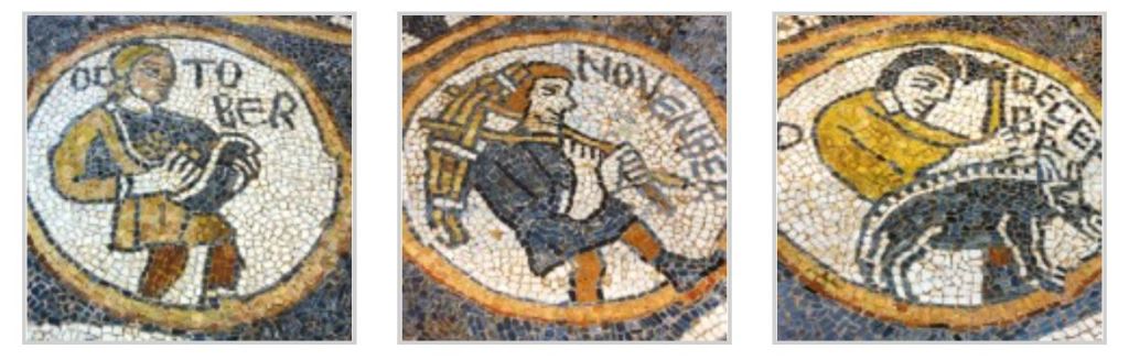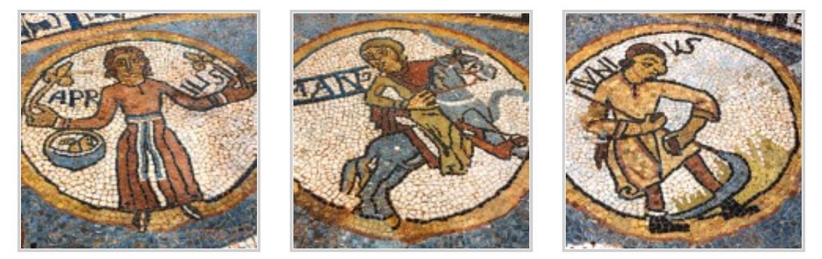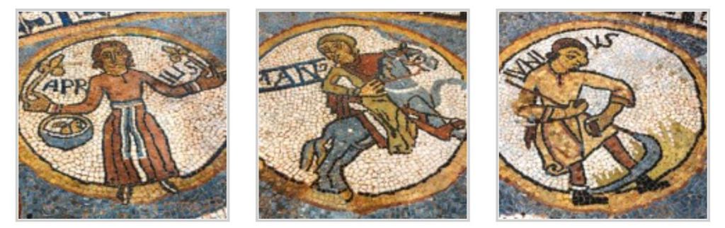 Se c’è un fiore, è il mese di aprile; se c’è un cavaliere, non c’è dubbio che sia maggio; se c’è un contadino che vendemmia, allora è il mese di settembre: queste tre simbologie sono quasi indiscutibili, nei cicli dei mesi del tempo romanico. Poi, per le rappresentazioni delle attività dell’uomo negli altri mesi dell’anno, è più complicato stabilire una regola precisa: mutano, infatti, le attività del contadino a seconda delle culture e delle latitudini… E però un aiuto viene dal ciclo dei mesi di Aosta: realizzato a mosaico, con tratti popolari e colori vivi, questo grande e bellissimo calendario pavimentale ha anche il pregio di proporsi un po’ come un canone; ci aiuta insomma a memorizzare “la regola”, il collegamento più comune tra il mese dell’anno e l’attività dell’uomo, nonostante esistano – e lo vedremo – una serie di eccezioni.