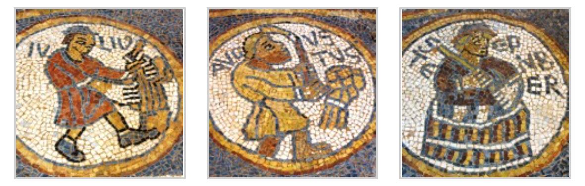 Giugno, Luglio e Agosto sono rappresentati ad Aosta da un contadino che lavora nei campi: a giugno falcia i prati verdi, a luglio miete il frumento, ad agosto batte il grano per ricavarne i chicchi e mettere al sicuro il raccolto nel granaio. Nella lunga stagione estiva i contadini in realtà compiono una serie complessa di attività all’aperto, e nei cicli dei mesi queste attività non sono sempre chiaramente rappresentate e facilmente identificabili; il calendario di Aosta però ci aiuta con precisione – e continua a costituire un canone, aiutandoci ad interpretare le stesse scene negli altri cicli medievali – almeno per i mesi di IUNIUS, dove è evidente che il contadino sta falciando erba verde, e per il mese di IULIUS, quando invece miete il giallo frumento. Per Agosto, invece, il mosaico di Santa Maria Assunta ha uno scatto di originalità: l’AUGUSTUS di Aosta si distacca dalla stragrande maggioranza delle altre teorie dei lavori agresti, che in questo mese collocano la preparazione delle botti, per scegliere, come abbiamo detto, la battitura delle spighe raccolte. Per inciso, anche a Venezia Agosto non si dedica alle botti ma… riposa nel caldo estivo.