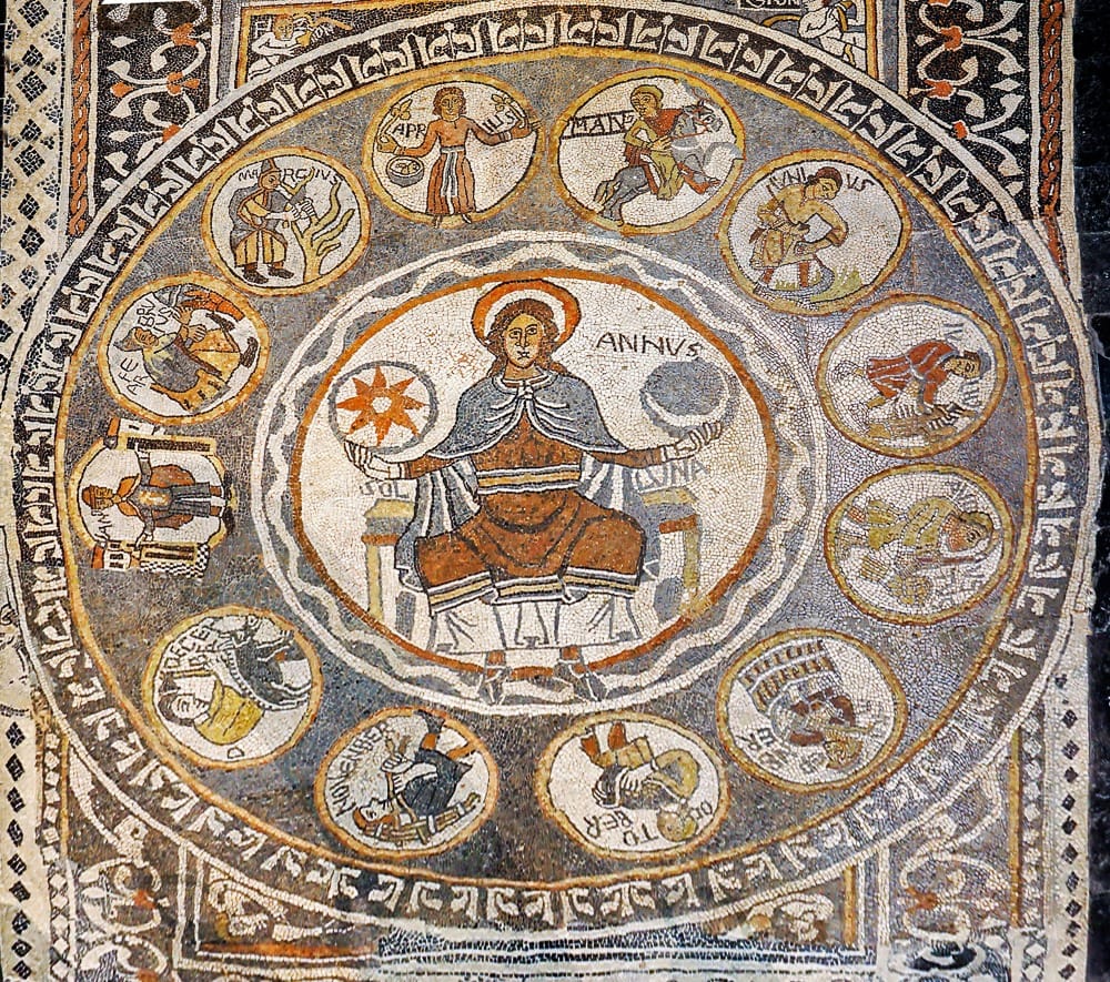 Questo mosaico è piuttosto tardo, alcuni lo datano addirittura al XIII secolo, prenderlo a modello per i calendari romanici mi pare azzardato, non lo considererei nemmeno un sunto delle serie dei mesi, che sono uno dei temi più diffusi sia nel pieno che nel tardo romanico.