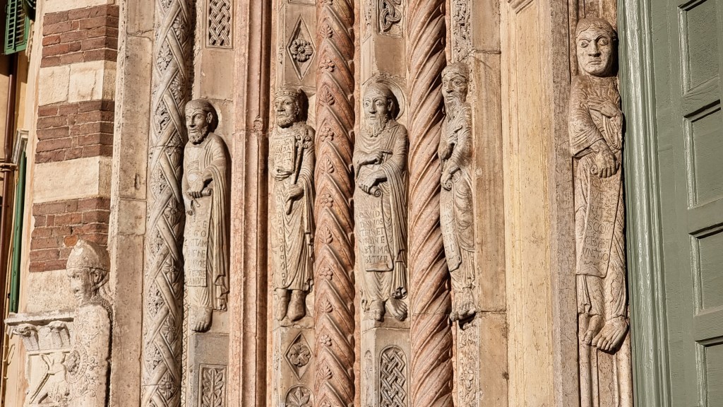 Dieci profeti e due paladini di Francia proclamano insieme che cos’è il romanico. Stanno in piedi davanti al duomo di Verona; sono stati schierati lì, come sentinelle, nelle strombature del protiro pieno di altre rappresentazioni, dallo scalpello di Niccolò, “il colto artista – come dice di se stesso nell’iscrizione con cui si incensa poco più in alto – che ha scolpito queste opere”.