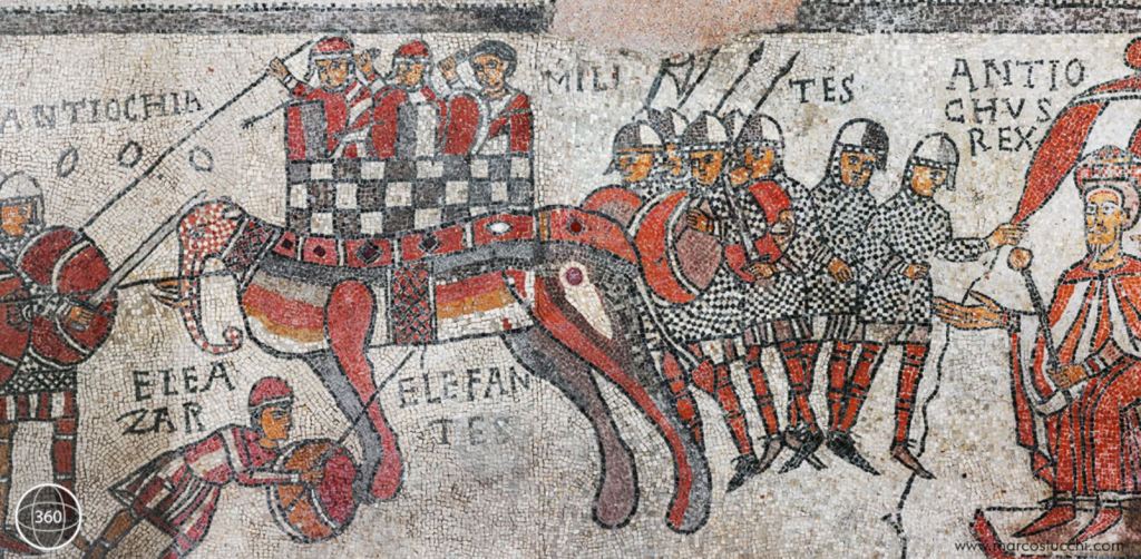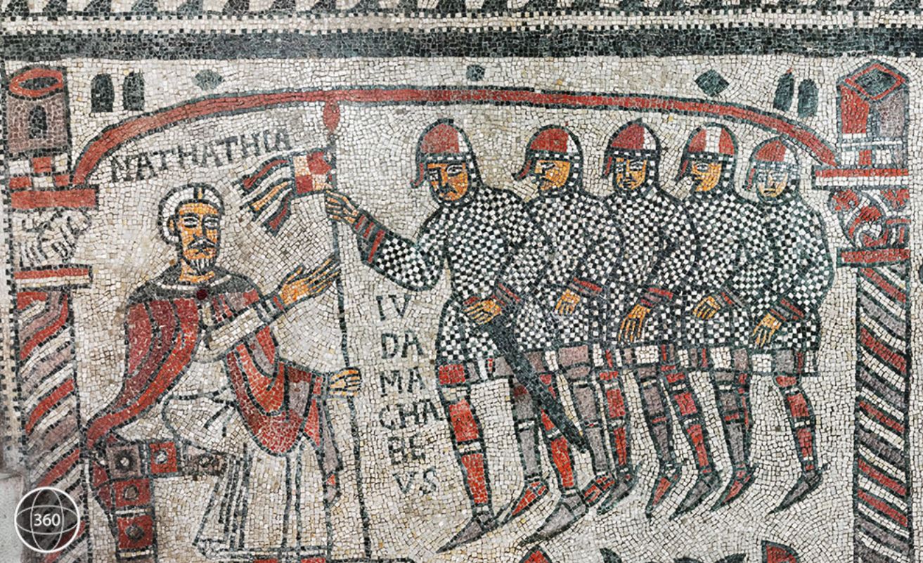 Assiste alla sconfitta da lontano, seduto sul suo trono, l’improvvido re Antioco. Come altri monarchi improvvidi dei tempi moderni, pensava forse di gustarsi dal suo palazzo una facile vittoria, ottenuta per procura inviando contro agli Ebrei le sue armate e i suoi generali. Ma l’ultima scena, nel registro superiore del mosaico, è impietosa: Giuda Maccabeo sta alla testa della cavalleria di Israele; di fronte a lui i cavalieri pagani tentano di opporsi ma sono ormai in rotta: alcuni, voltate le spalle al nemico, già fuggono, e al suolo, tra i corpi dei soldati uccisi, c’è quello di Gorgia, generale seleucide, che trafitto da una lancia ha trascinato con sé nella polvere lo stendardo del suo re.