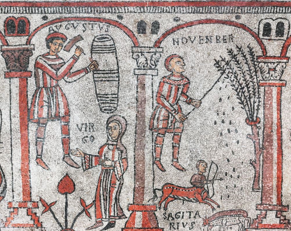 Il pavimento musivo con le storie dei Maccabei risale al XII secolo. Pur se giunto a noi incompleto, riscoperto ai primi del Novecento sotto uno strato di terra e sotto la successiva pavimentazione, costituisce la più importante traccia romanica della potenza dell’abbazia di Bobbio, in Val Trebbia, ora territorio della provincia di Piacenza. Le scene di guerra, nella parte superiore del pavimento, sono completate da un duplice combattimento mitologico: un centauro sfida una chimera, e a sua volta un “lemnas“, con la sua testa ben piazzata al posto del petto, affronta un drago che vola e sputa fuoco. Nei due vasti registri inferiori il pavimento presenta un interessante “ciclo dei mesi”, con le raffigurazioni dei lavori dell’uomo nelle varie stagioni e dei segni zodiacali corrispondenti.