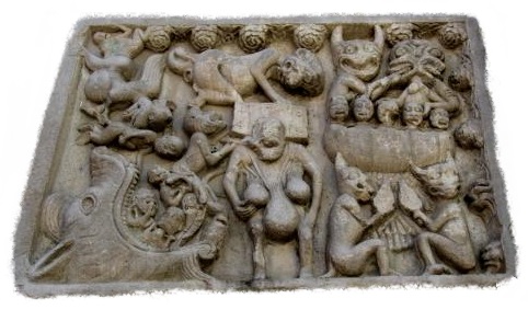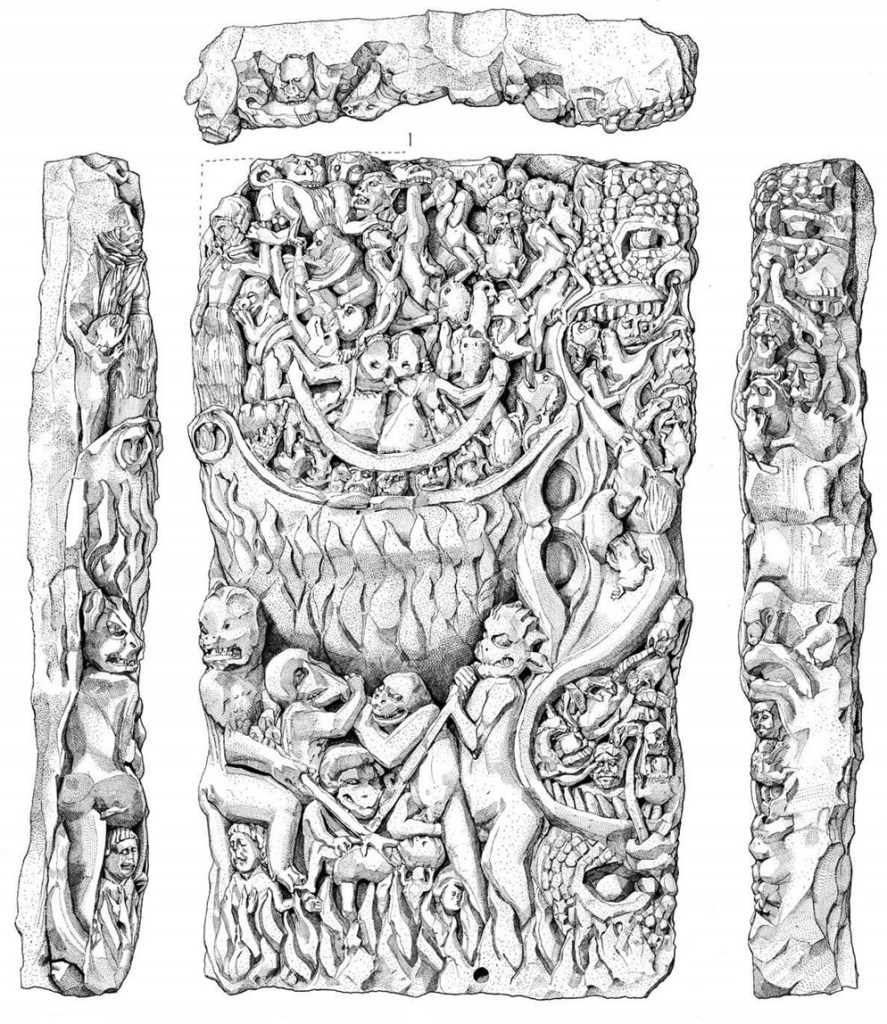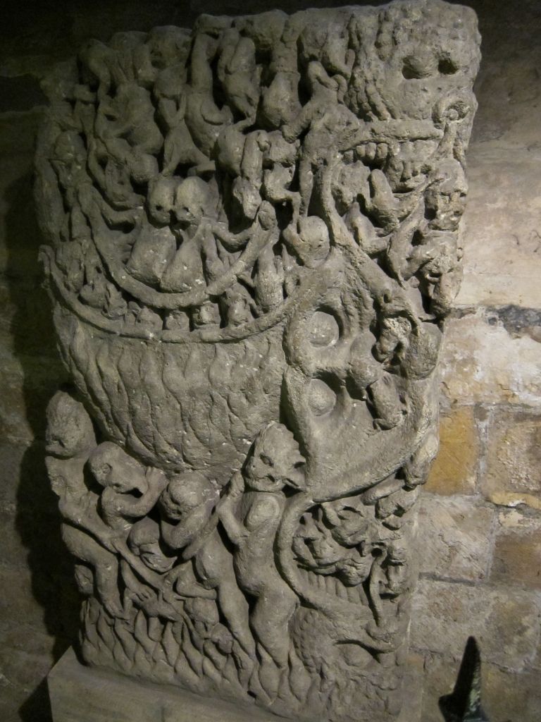 Contrariamente a quanto si potrebbe pensare, questa grande rappresentazione della fine dei rei, scolpita sulla “Doomstone“, cioè sulla “Pietra del destino”, nella cripta del Duomo di York, costituisce quasi un unicum nel tempo romanico: ci sono, è vero, numerose altre rappresentazioni medievali dei tormenti infernali; e però queste rappresentazioni sono, nel XII secolo, quasi sempre associate alla visione del Giudizio Finale, della seconda venuta del Salvatore, ed è impossibile non ricordare qui i timpani di Autun e di Conques; è raro invece che l’inferno – la “lastra” di Fornovo nel Parmense costituisce un’ulteriore eccezione – sia rappresentato così, come realtà a sé stante, con un gusto dell’orrido e del grottesco che verrebbe da definire più proprio del gotico che del romanico.