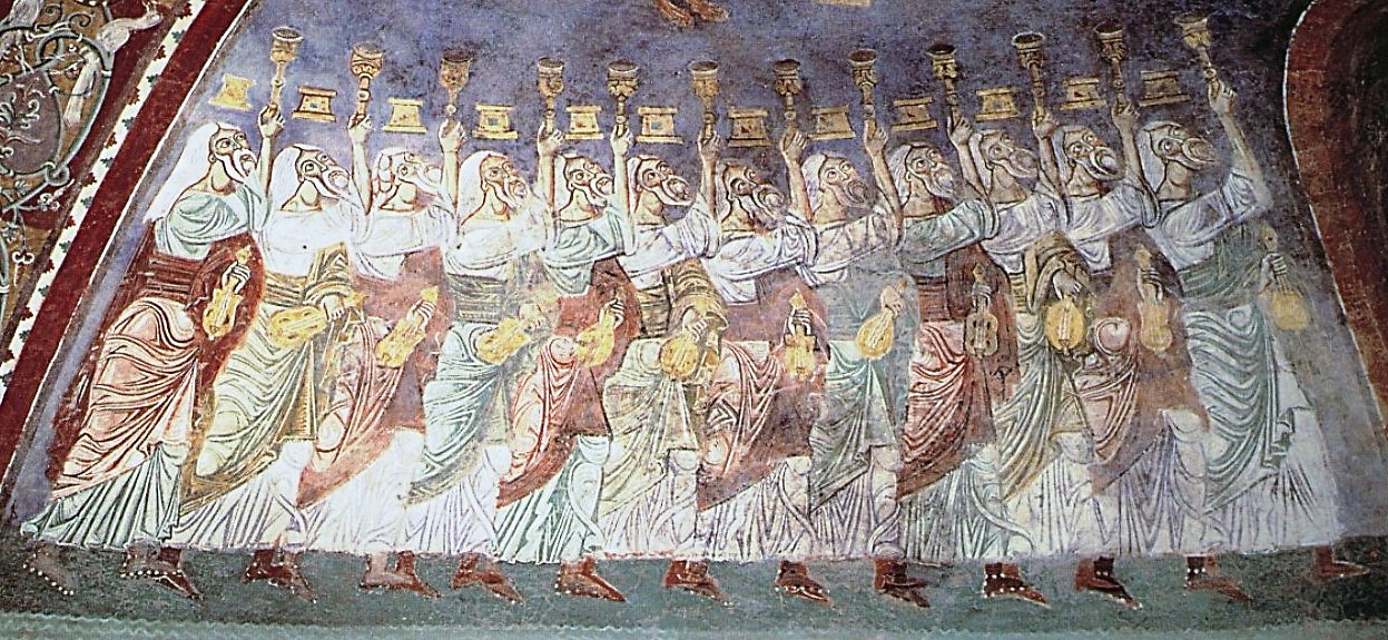 E insomma, se non fosse per l’Agnello al posto del Salvatore, la scena affrescata ad Anagni è proprio quella della visione di Giovanni: al centro dell’abside c’è il varco nei cieli, con tanto di arcobaleno; ci sono i “Viventi”, con le loro ali piene di occhi, che fanno da corona, ci sono i ventiquattro anziani – in piedi, che anche i loro seggi, come il trono, sembrano dimenticati – e c’è il “mare trasparente simile a cristallo”, che il frescante rappresenta proprio là dove i ventiquattro Vegliardi camminano, e più avanti si dirà “avendo ciascuno una cetra e coppe d’oro colme di profumi, che sono le preghiere dei santi”. Poi, nel racconto dell’Apocalisse, entra in scena l’Agnello: