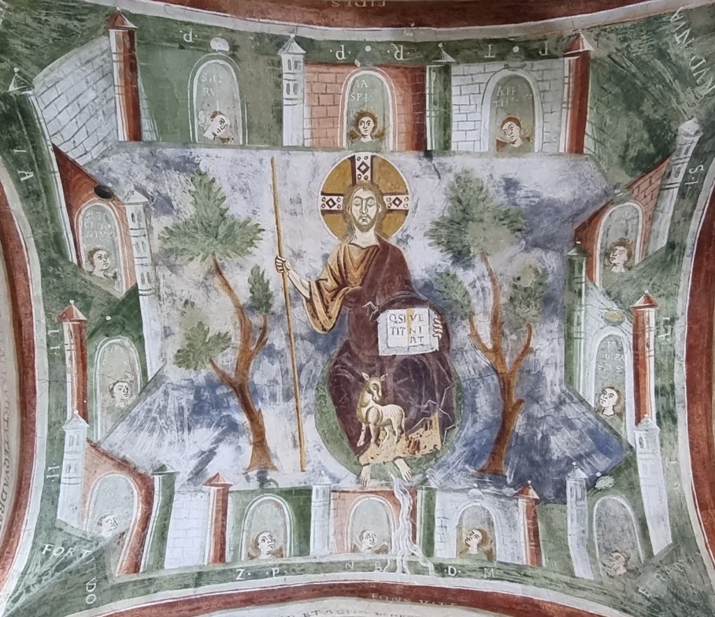 Coraggioso, e allo stesso tempo rigorosamente legato al testo apocalittico, il frescante di Anagni sceglie di dipingere, nell’abside della splendida cripta affrescata, uno strano Agnello; ed è intorno a questo strano Agnello che ruota ogni cosa. Ci saremmo aspettati un Cristo giudice, in questa posizione cruciale, nel catino dell’abside; infatti è il Cristo giudice e salvatore che, seduto in trono, in tante altre absidi e in tanti altri portali ha il ruolo di protagonista della “seconda venuta”, del giorno del giudizio finale… Ad Anagni, invece non è così.