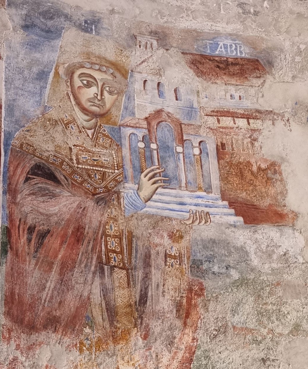 Parla, Desiderio. Lo fa portando in mano il modellino della basilica in cui ci troviamo, e alzandolo verso il Cristo in gloria: dice in questo modo che è lui il “donatore”, e che per volere suo, e non di altri, la chiesa rende gloria al Signore così bella. In realtà anche Desiderio – che era il grande abate dalla grandissima abbazia di Montecassino, poco distante – aveva a sua volta ricevuto in dono la basilica di Sant’Angelo in Formis dal signore normanno di Capua, Riccardo Drengot, nel 1072.  Ma poiché è Desiderio ad essere raffigurato nell’abside, in posizione allo stesso tempo umile e di primissimo piano, noi siamo certi che proprio a lui si debbono gli affreschi che ci circondano: garantisce, questo ritratto dell’abate, che tutto qui fu fatto sotto la regia di Desiderio, il “principe” della potente Montecassino.