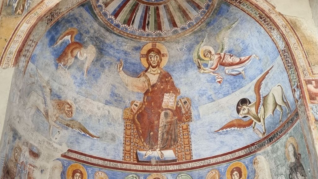 Il quale sta lì nell’abside, a sinistra, nella grande fascia che corre sotto il “catino” vero e proprio, dove giganteggiano i tre stupefacenti arcangeli, e apre così la parata che è chiusa, più a destra, un san Benedetto purtroppo molto meno fiammeggiante; sta lì, Desiderio, e con gli arcangeli e con Benedetto omaggia il grande Cristo che, più sopra, squarcia i cieli, “maestro severo dell’universo, che comanda e giudica implacabile”, secondo la Wettstein, ma anche “giudice dallo sguardo fisso”, secondo Raymond Oursel, attorno al quale “i simboli degli Evangelisti vagano in un firmamento ben troppo ampio, quasi lasciati alla deriva”. Sta lì, l’abate Desiderio, e dice molte cose interessanti; e per capire Sant’Angelo in Formis occorre, prima o poi, parlare con lui.