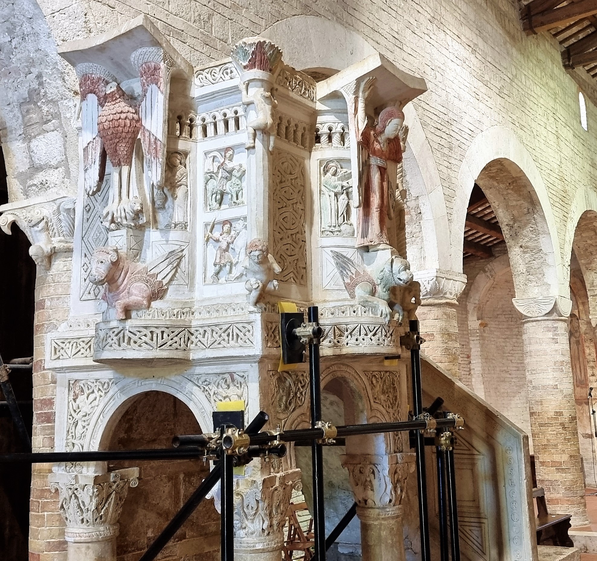E’ una vera tristezza vedere l’ambone di Moscufo così puntellato con quei tubi neri. Spero che presto si possa tornare ad ammirarlo libero nella sua bellezza.