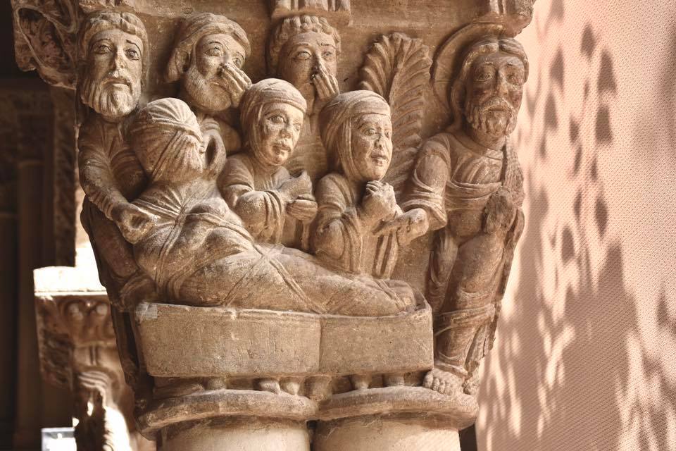 In questo loro sforzo di trasformare in immagini la strabiliante potenza dei gesti di Gesù – fin da quando la sua vita terrena si stava ancora preparando nel ventre santo di Maria – gli artisti del tempo romanico trovarono nei quattro Vangeli, e non solo in essi, un patrimonio infinito di materiale da narrare e far brillare: dalle vicende della Natività, con il suo corollario di personaggi e di fatti, fino a quelle della Passione, così ricche di pathos e di insegnamenti salvifici; e poi, nel mezzo, quella lunga e appassionante serie di incontri, di parabole, di miracoli, di sguardi e di scontri, di domande e di risposte che costituiscono la breve e intensissima vicenda terrena del Dio incarnato. E così, il volumetto LE STORIE dei Vangeli NELL’ARTE ROMANICA, in cui sono riproposti alcuni dei tanti articoli via via pubblicati in beforechartres.blog, si apre con un capitello bellissimo, quello della Natività scolpito in San Juan de Ortega, che nei suoi pochi decimetri di pietra narra tutta la storia della nascita del Bambino; e si chiudono con una delle più festose rappresentazioni dell’Ascensione, scolpita nel piccolo portale di una piccola chiesa di Francia. In mezzo, altri quattordici pagine di vita del Maestro. L’incontro con l’emorroissa dipinto a Mustair, il dialogo con Lazzaro, che sta sull’albero in un capitello di Saint-Nectaire, la crocefissione di Monjardin, la deposizione di Aguilar de Campoo, e il cammino fatto insieme ai discepoli di Emmaus, magistralmente scolpito a Silos… sono solo alcuni di questi magici momenti di umanità e di fede.