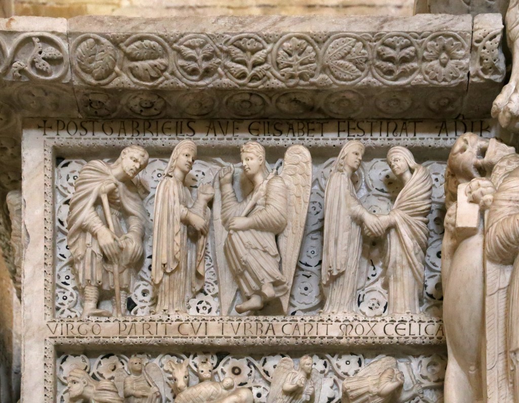 Fecero festa, a Cagliari, all’arrivo della nave col suo carico in marmo. Il dono dei Pisani, oltre a rimarcare l’amicizia e l’alleanza tra le due città in un epoca di fermenti, era senza dubbio un regalo di gran pregio: Guglielmo aveva scolpito e assemblato il suo pulpito poco dopo la metà del XII secolo, proprio negli anni in cui, anche in Italia, la scultura romanica toccava vertici di assoluta perfezione. Niente si lasciava più al caso, in quei decenni, e al vigore dell’arte romanica degli inizi si era aggiunta un tecnica scultorea ormai matura, supportata da una sapienza teologica diffusa e approfondita. Nel Duomo romanico di Pisa, il pergamo di Guglielmo era un’opera di grandissimo impatto. Costituito da un “cassone” unico, formato da otto pannelli scolpiti, era retto da colonne su quattro leoni stilofori. I pannelli narravano gli episodi dell’Annunciazione, della Visitazione, della Natività, e poi l’Adorazione dei Magi e il loro viaggio; e ancora gli episodi della visita dei Magi ad Erode e della Strage degli innocenti, e la Presentazione al tempio; poi Guglielmo aveva rappresentato l’episodio del Battesimo di Gesù nel Giordano, la Trasfigurazione, l’Ultima Cena e il Bacio di Giuda, e la Resurrezione, e le Pie Donne al sepolcro… L’ampia “cassa” rettangolare, realizzata dall’assemblarsi di queste lastre scolpite al di sopra delle colonne portanti, era infine impreziosita da due distinti leggii, entrambi posti, paralleli e in posizione paritetica, sul lato lungo del pergamo: dei due lettorini, il primo era utilizzato per la proclamazione del Vangelo, ed era decorato con la figura del Tetramorfo; mentre sull’altro, dedicato alla lettura dell’Epistola, stava la figura di san Paolo, dietro al quale si riconoscevano Tito e Timoteo, cioè due dei destinatari delle Lettere redatte dall’Apostolo delle Genti.