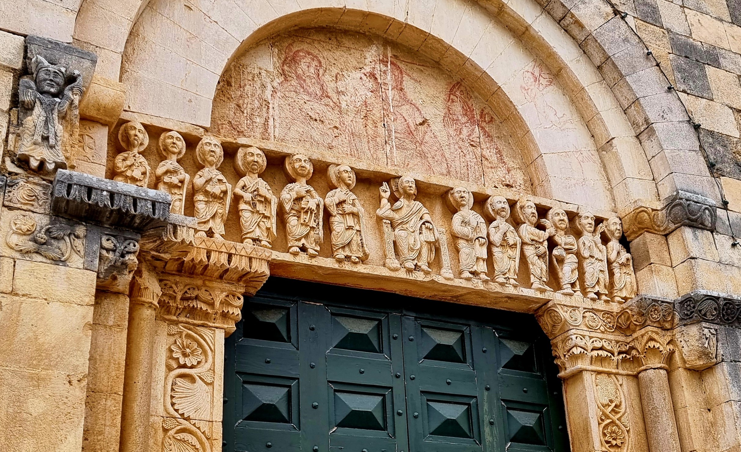 All’ingesso, ad accogliere il visitatore è l’architrave con la schiera degli apostoli arrabbiati, disposti in dodici ai lati di un Cristo seduto. Basterebbero queste figure dai colli lunghi, scolpite con una semplicità tra il patetico e il sorprendente, a rendere preziosa la facciata. E già alla loro sinistra una figura particolare dà il via alle domande e alle ipotesi dei cacciatori di misteri: sembra un mago orientale, anche se è più probabile che rappresenti proprio san Tommaso Becket, l’arcivescovo di Canterbury a cui la chiesa è dedicata; più sotto è rappresentato un altro religioso, con il suo pastorale: si tratta forse di padre Berardo, il committente della chiesa; altre formelle – quelle in cui si disegna il “fiore della vita”, e l’altra con il green man, e ancora quelle con il serpente solitario e con un’aquila stilizzata… – spuntano all’improvviso sul muro piatto della facciata, e attirano l’attenzione e incuriosiscono: le interpreta con dovizia di particolari, per chi si appassiona a simboli e ricostruzioni, la pagina dedicata alla chiesa nel blog Viaggi nella storia.