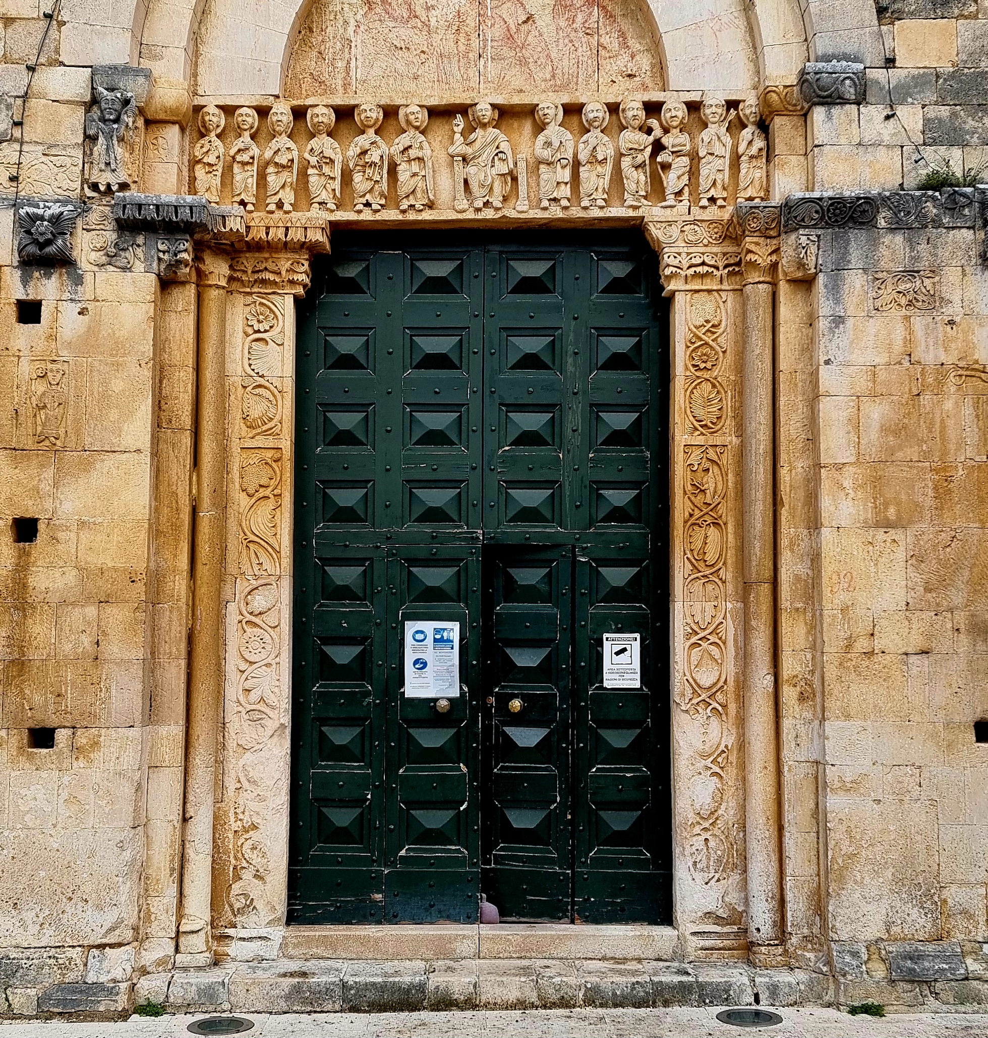 Non c’è il ciborio, a coprire l’altare, nel presbiterio della chiesa di San Tommaso a Caramanico Terme: e non c’è neanche, ad impreziosire la navata, un pulpito, un ambone scolpito. Eppure l’Abruzzo romanico, lo abbiamo visto bene, è proprio la terra dei cibori e degli amboni… Pensandoci bene, questa di Caramanico è l’unica tra le grandi chiese della regione che manca di entrambi i grandi arredi liturgici: restano, due piazzati a metà navata e due a guardia dell’area presbiteriale, quattro leoni “stilofori”, che forse erano stati scolpiti per portare, appunto, le colonne di un pulpito; e però – chissà perché – la navata alla fine restò spoglia; lo stesso accadde in facciata, dove il portico che avrebbe dovuto coprire i portali fu solo impostato – i quattro pilastri addossati sono il segno evidente di questo progetto – e però non venne mai portato a termine.