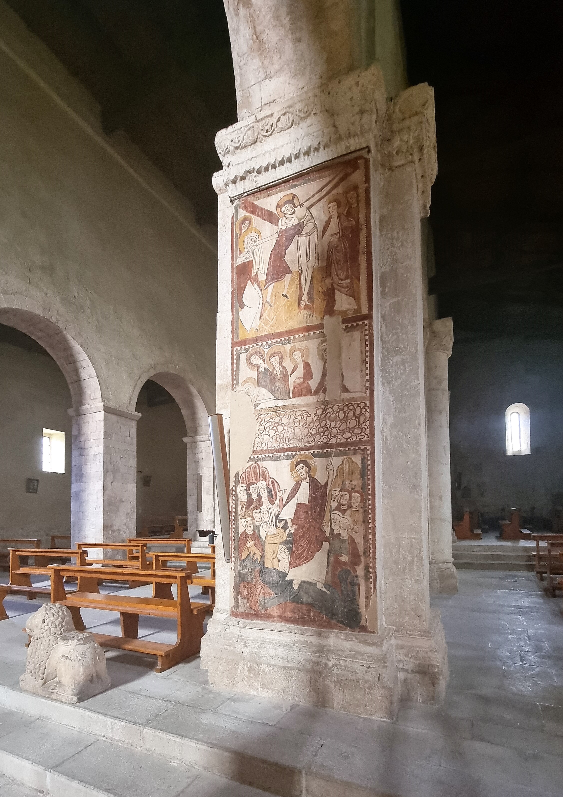 Ma è all’interno che la basilica di Caramanico gioca la sua carta vincente, quella che la inserisce a buon diritto tra le chiese che piacciono agli Indiana Jones del tempo medievale. Mentre infatti tutta la navata è affiancata, da una parte e dall’altra, da pilasti possenti, uno solo dei sostegni, a destra, poco distante dall’ingresso, è costituito da una colonna quadrata, decisamente esile, quasi sofferente: la tradizione vuole che questa “colonna santa” fosse stata portata in loco direttamente da un angelo e che, collocata per suo volere nella navata, abbia conservato potenti poteri taumaturgici. Sottile di suo, è stata nei secoli ulteriormente erosa dalle mani dei fedeli che l’hanno toccata, e che a volte ne hanno portato via la polvere, certi della capacità del suo marmo di curare le malattie e di restituire la fertilità alle donne sterili. Difficile dimenticare l’effetto che fa, nella penombra di una navata tutta retta di forti pilastri, questo sostegno debole, per di più sovrastato da un capitello ricco e decisamente fuori scala. Per tutelarla, i secoli moderni dapprima ricavarono sopra la “colonna santa” un arco di scarico, spostando così altrove il peso che essa sembrava non saper portare; più recentemente è stata posta attorno alla colonna una protezione in ferro e vetro: evidentemente perduravano ben al di là dei confini temporali del medioevo le credenze, quasi pagane, che attribuivano alla colonna poteri inusuali, e portavano fedeli e visitatori a toccarne e a sfregarne impropriamente il fusto.