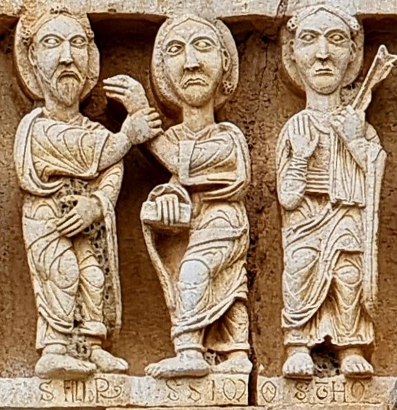In ricordo della sua incredulità, vi si aspetterebbe di vedere attribuito quel gesto a San Tommaso, il quale invece si dispone alla sinistra di San Simone e, a differenza di tutti gli altri, tiene sollevato, al di sopra della spalla sinistra, un cartiglio ripiegato. Che il lapicida abbia equivocato, nel disporre i nomi, ingannato da un gesto che interpretava come giuridicamente adatto a distinguere quello che egli, a torto, riteneva il santo titolare?