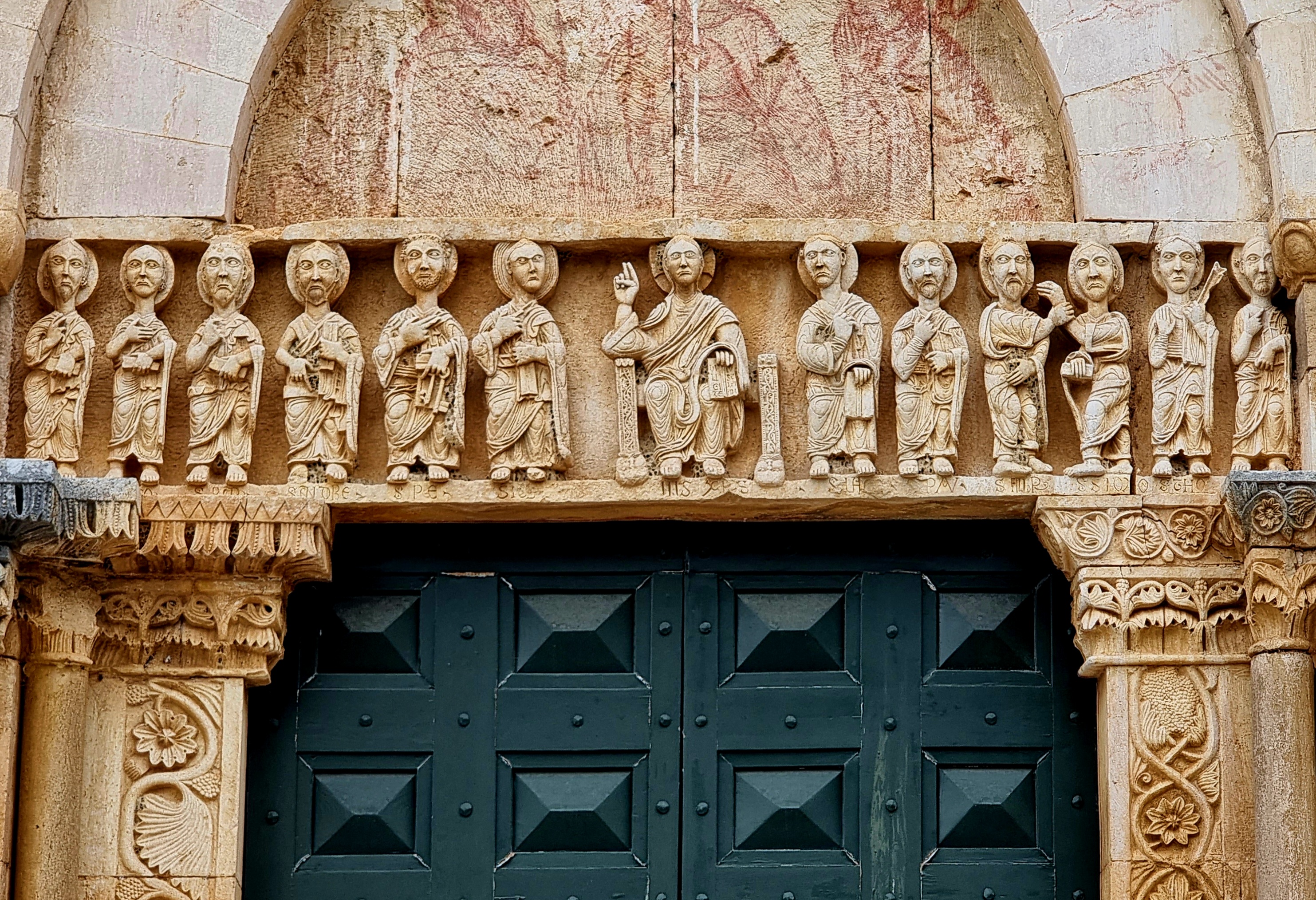 I nomi scolpiti sotto ciascuno degli Apostoli, come spesso accade, non sono di facile lettura, e così un poco ci aiutano gli attributi che, già nel tempo romanico, vennero associati dagli artisti a ciascuno dei Dodici. Possiamo innanzitutto identificare, per questa via, il buon Pietro che, con le sue chiavi in bella vista sul petto, è il quinto da sinistra. L’apostolo che sta alla destra di Pietro, è il fratello, Andrea: stavolta è l’iscrizione – “S. ANDRE” – piuttosto chiara, ad aiutarci nell’identificazione. Un passo ancora e diamo un nome ai due apostoli che stanno più vicini al Cristo in trono: alla sinistra del Salvatore ci pare di poter identificare, anche qui grazie all’iscrizione – leggiamo un “S. JACO” -, l’apostolo Giacomo, rappresentato senza barba; e poiché per tradizione l’apostolo imberbe, il più giovane, dovrebbe essere Giovanni, allora giocoforza riconosciamo l’apostolo “che Gesù amava” nella figura scolpita alla sinistra del Cristo.