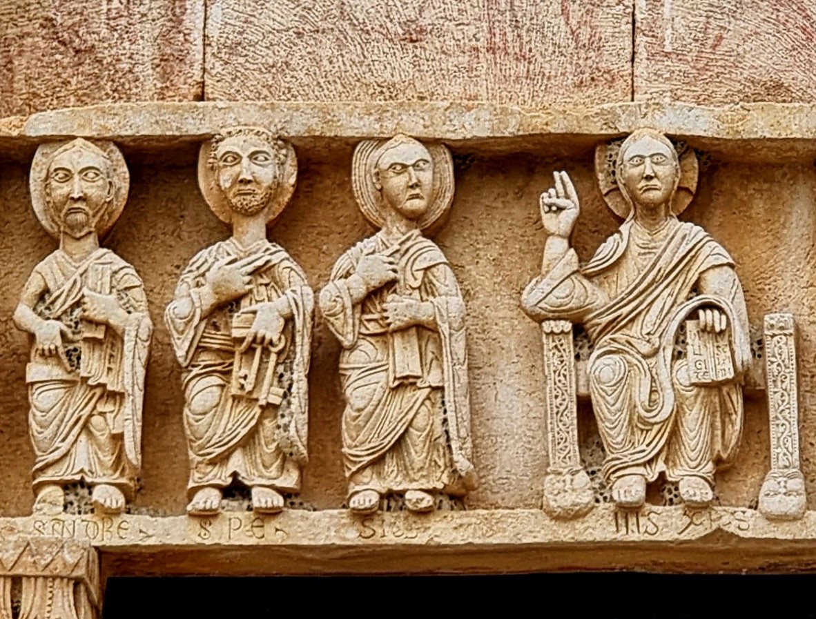 Osserviamo meglio queste figure, una delle più belle figurazioni scultoree dell’Abruzzo romanico – “il più significativo esempio di rappresentazione della figura umana documentata agli inizi del XIII secolo”, secondo il Moretti – e proviamo ad identificare, là dove si può, i dodici personaggi, per arrivare a capire chi sono – e chi sono davvero! – i due apostoli che sembrano confrontarsi in modo acceso.