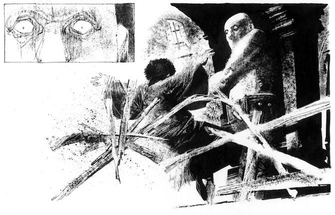 Una tavola di Will Eisner e sotto a sinistra una tavola di Sergio Toppi
