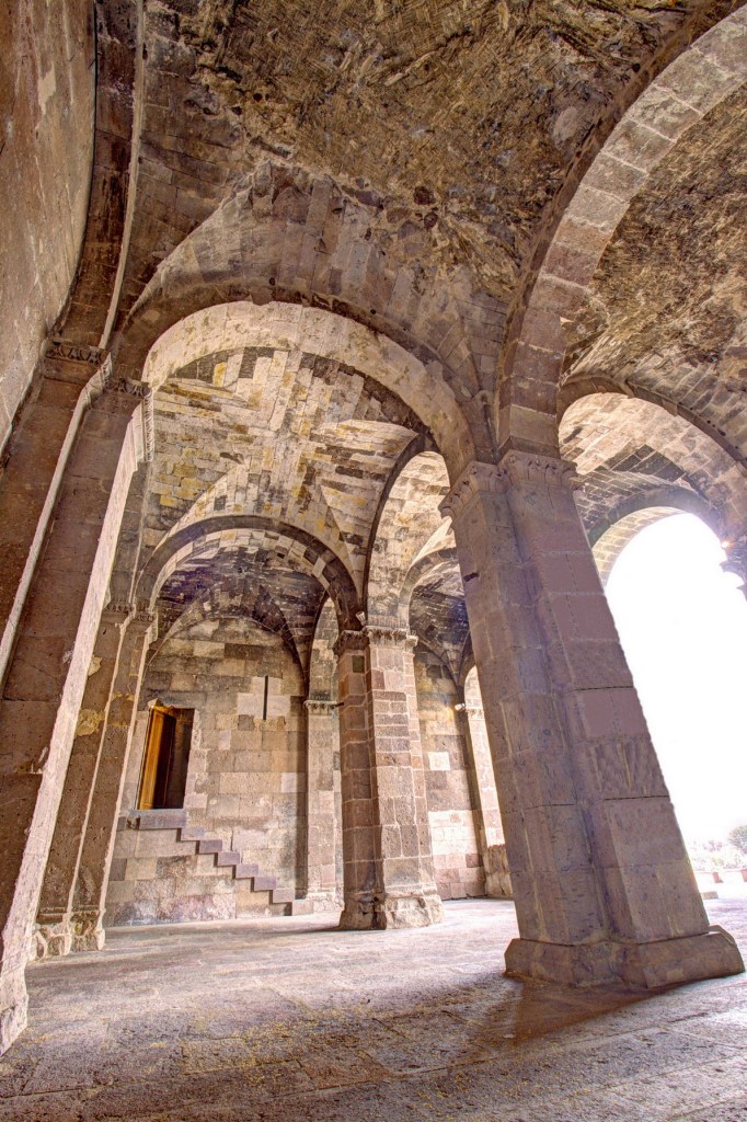 Si attraversa, avvicinandosi a Sant’Antioco di Bisarcio, un altro di quei varchi magici che, come per incantamento, ci immergono nel tempo specialissimo che fu il medioevo. Posta in alto, possente, a dominare la piana brulla che la circonda, con il campanile mozzato che pare una torre, l’antica cattedrale sembra quasi un castello di guardia. Come spiega benissimo Renata Serra, “l’edificio si raggiunge per un sentiero scosceso, che ne rivela gradualmente le imponenti strutture in scura trachite, con tonalità diversissime dal marron cuoio al rosso purpureo, chiazzate di muschi”. Gli interventi più recenti hanno forse tolto un po’ della patina fascinosa, e un po’ del muschio; resta però indubitabile quanto la studiosa sottolinea, e cioè che per la natura del sito, per la posizione panoramica in cui è stata costruita, per la qualità dell’architettura e delle sue finiture, la basilica di Sant’Antioco è tra le più interessanti tappe di un itinerario romanico in Sardegna.
