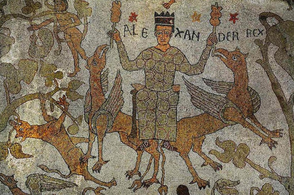 Non si tratta però di una semplice inversione. Accade invece che Pantaleone e i suoi, secondo un’interpretazione piena di fascino, seppero guardare al grande albero della storia dell’uomo come ad una pianta vivente. E di questa pianta vivente, le vicende di Adamo ed Eva furono i primi frutti, quand’essa non era che un virgulto; e poi la pianta crebbe, e mentre quei primi frutti cominciarono a salire, portati verso l’alto, l’albero mise rami nuovi, e in questi rami nuovi, subito successivi alla cacciata dal Paradiso terrestre, sbocciarono come fiori il tempo dell’uomo e le sue fatiche, rappresentati dai mesi dell’anno; e poi anche questi rami nuovi salirono più in su col passare del tempo, e sotto di loro le nuove fronde cominciarono ad accogliere le vicende del popolo eletto, e gli episodi della Bibbia, e la storia della Salvezza. I rami più bassi – quelli più vicini al suolo e all’ingresso della chiesa – sono in quest’ottica i più recenti, e a buon diritto si candidano ad ospitare le vicende storiche, tra cui il “volo” di Alessandro.