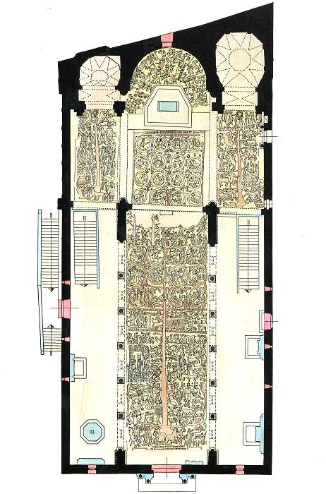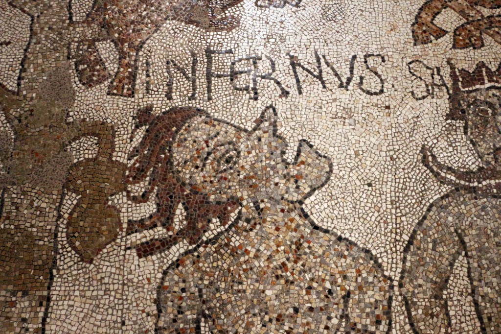 Due aree del pavimento della chiesa, ancora, sono completamente decorate a mosaico: il presbiterio raccoglie in sedici cerchi altrettanti animali e mostri del bestiario antico, forse a voler figurare i vizi e le virtù degli uomini; nel pavimento del semicerchio absidale, infine, si possono ammirare il racconto della storia del profeta Giona, Sansone che lotta con una fiera, e altre figure umane, bestiali e di combattimento.