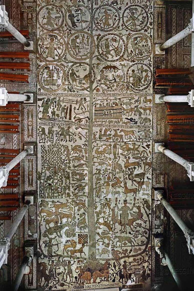 Ma il cuore, l’asse portante del grande pavimento musivo voluto da Pantaleone, è l’albero maggiore, quello della navata principale. Il quale, pur nell’apparente disordine, pur con un linguaggio onirico e quasi delirante, delinea in sostanza la vicenda dell’Uomo dai suoi primi passi nell’Eden. E lo fa, dicevamo, con un’apparente inversione. Proprio in fondo alla navata, là dove sta la cima dell’albero, si trova infatti il paradiso terrestre, con le vicende di Adamo ed Eva e della loro colpa; scendendo, tra i rami, incontriamo i dodici mesi con le dodici occupazioni dell’uomo; più giù ancora sono narrate le vicende della Bibbia, tra cui spiccano la vicenda di Noè e del diluvio e la grande istantanea della costruzione della Torre di Babele; proprio vicino alle radici stanno, infine, la rappresentazione di mostri, divinità pagane, cacce, centauri cavalli e scacchiere, e quella di Alessandro Magno e i suoi grifoni, che sembrano voler riassumere, dopo quella del popolo eletto e della salvezza, la storia più recente degli uomini e dei regni.