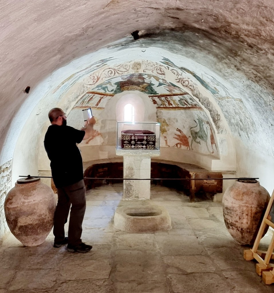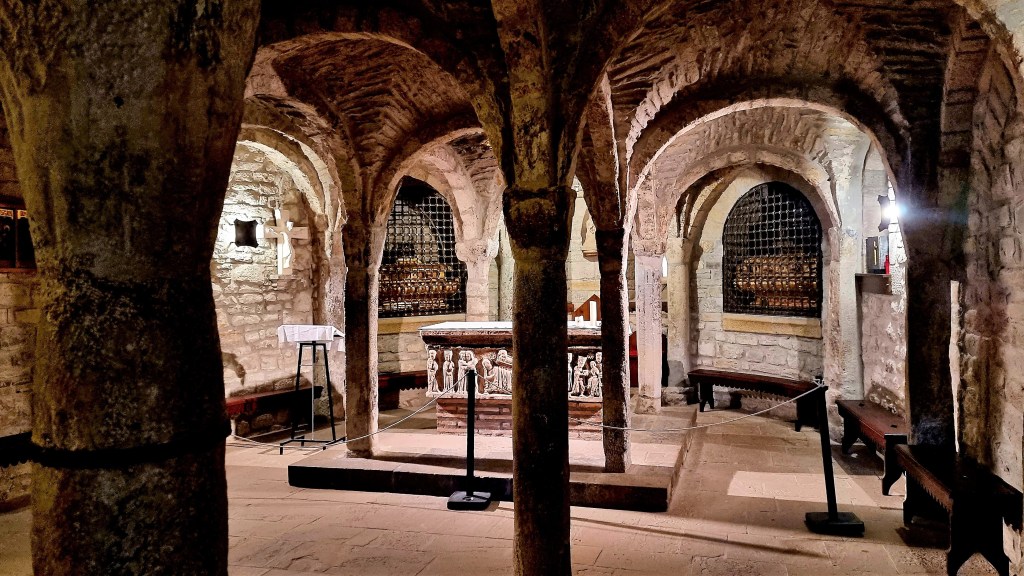 Durante i secoli, dicevamo, più e più volte si modificò e si arricchì la chiesa medievale, proprio per renderla confacente alla dignità di cattedrale. E l’unica parte che non fu mai toccata nella struttura, tanto che qui ancora vengono in pellegrinaggio molti viaggiatori romanici, è la cripta. La quale, costruita nell’XI secolo, è molto particolare: sovrastata dal presbiterio, infatti, è posta ad un livello solo leggermente più basso rispetto al piano della navata, e vi si accede direttamente della navata stessa, scendendo pochi gradini. Per nulla nascosta, quindi, la cripta di Roda de Isabena richiama piuttosto certe “chiese inferiori”, particolari perché direttamente in contatto con l’aula; ed è inevitabile un collegamento con la “tribuna” della chiesa abbaziale di Cruas, in Francia, e con l’esempio, che pure è più tardo, di Santa Maria a Pie’ di Chienti, nelle Marche.