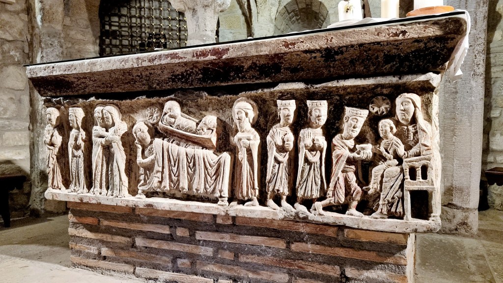 Tre basse navate, coperte da nove rudi crociere, conducono alla parte più sacra della cripta, quella absidale, a sua volta coperta da altre crociere. E qui è custodito il pezzo più bello e più prezioso, il sarcofago scolpito per conservare le spoglie di san Raimondo, quel Raymond Guillame che, giunto da Tolosa, fu vescovo di Roda de Isabena all’inizio del XII secolo – una nuova conferma che tutto qui gira intorno alla dignità di cattedrale che fu donata a questa chiesa – e dopo la morte fu canonizzato per i meriti conseguiti con il suo episcopato, tutto dedicato alla difesa della fede. Adagiato oggi al centro del presbiterio della cripta, il sarcofago era stato in origine pensato per essere collocato a muro, e per questo è scolpito solo su tre lati: nel primo lato breve è rappresentato lo stesso vescovo Raimondo – o secondo altri il primo pastore dalla diocesi di Roda de Isabena, Odesindo – tra due chierici; nella lunga faccia principale scorre la narrazione delle vicende dell’Infanzia, dall’Annunciazione all’Adorazione dei Magi; e il racconto si conclude nel secondo lato corto, dov’è scolpita la Fuga in Egitto. Le fonti, oltre che lo stile della scultura, ci informano in modo esplicito sul periodo in cui è stato scolpito il sarcofago: ci dicono, infatti, che fu nel 1170, a cinquant’anni o poco meno dalla sua morte, che la salma del santo prelato fu tumulata in un sarcofago “NOVO LAPIDEO MIRIFICE OPERATO”.
