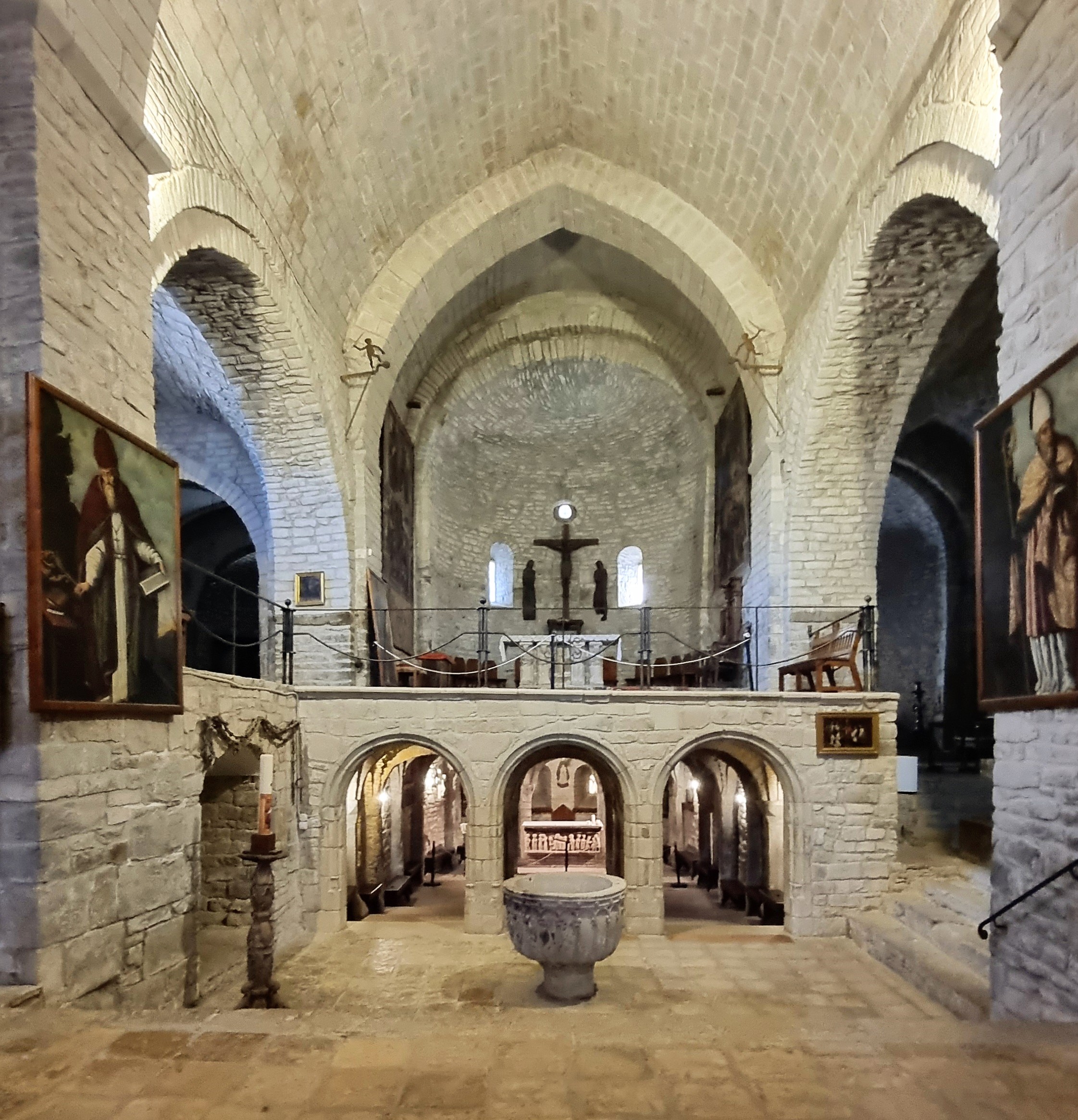 Durante i secoli, dicevamo, più e più volte si modificò e si arricchì la chiesa medievale, proprio per renderla confacente alla dignità di cattedrale. E l’unica parte che non fu mai toccata nella struttura, tanto che qui ancora vengono in pellegrinaggio molti viaggiatori romanici, è la cripta. La quale, costruita nell’XI secolo, è molto particolare: sovrastata dal presbiterio, infatti, è posta ad un livello solo leggermente più basso rispetto al piano della navata, e vi si accede direttamente della navata stessa, scendendo pochi gradini. Per nulla nascosta, quindi, la cripta di Roda de Isabena richiama piuttosto certe “chiese inferiori”, particolari perché direttamente in contatto con l’aula; ed è inevitabile un collegamento con la “tribuna” della chiesa abbaziale di Cruas, in Francia, e con l’esempio, che pure è più tardo, di Santa Maria a Pie’ di Chienti, nelle Marche.