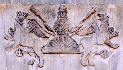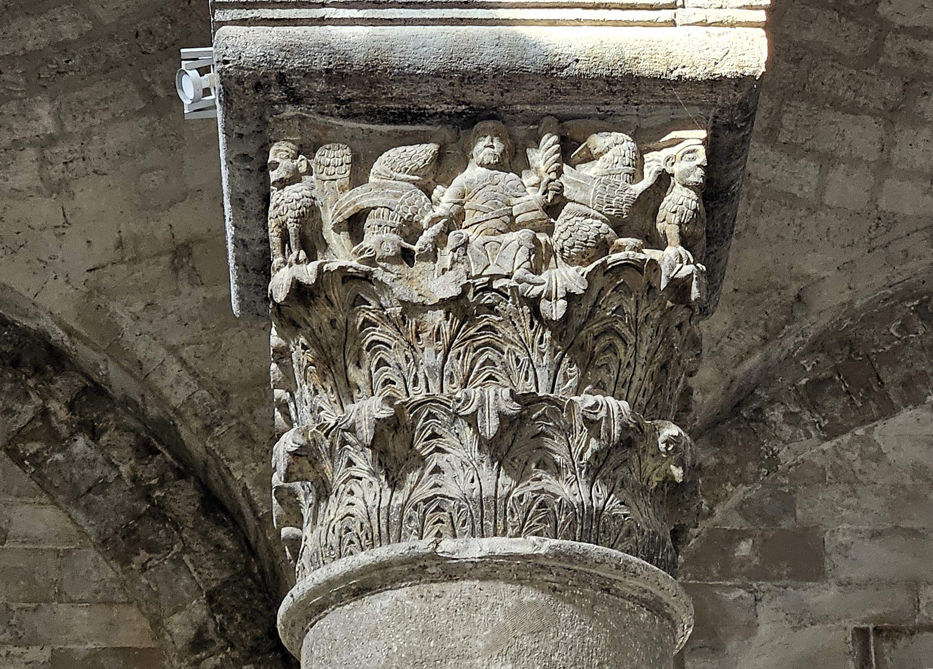 La più bella rappresentazione romanica del volo di Alessandro, così, è forse quella scolpita su uno dei capitelli della basilica di Bitonto, speciale e significativa perché mostra, a modo suo, entrambi i momenti dell’impresa di Alessandro, la salita e la discesa, ed esplicita così entrambi gli aspetti e le contraddittorie valenze dell’impresa stessa. Su un lato del capitello, infatti, troviamo la rappresentazione canonica del re che sale, con le sue aste protese verso l’alto e i grifoni che affiancano il trono e lo sollevano in volo. Ma sulla faccia contigua la scena perde la consueta simmetria: al centro sta ancora il re seduto in trono; ma mentre con la lancia nella mano sinistra Alessandro punta ancora verso il cielo, quella che impugna con la destra è già rivolta verso il basso; il grifone ha già invertito il suo volo, e insegue l’esca a becco in giù, e già sta riportando la navicella del re macedone verso il punto di partenza, e verso una ben più umile consapevolezza dei limiti umani.