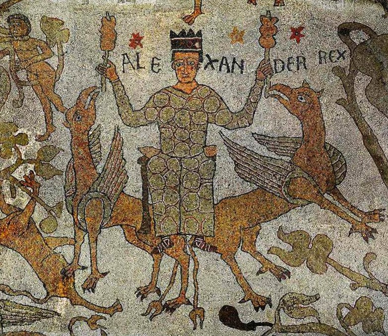 Non sono gli storici antichi a raccontare del “volo di Alessandro”; se ne parla invece in una tradizione che si diffonde nei primi secoli del cristianesimo, e si consolida nel Romanzo di Alessandro attribuito a Callistene. Nell’alto medioevo, ed è questo che ci interessa, la leggenda del re che salì fino al cielo venne rilanciata con forza, nell’Occidente cristiano, dalla Historia de preliis Alexandri Magni, un testo databile al X secolo e attribuito a Leone Arciprete, religioso campano.
