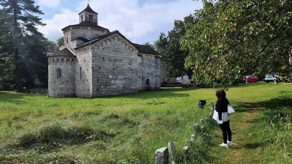 Quando salendo dal lago e arrivando da oriente ci appare sullo sfondo di un prato verdeggiante con la sua abside guarnita da un’aerea loggia gentile si prova una forte emozione e così ancora ammirando i suoi nitidi volumi, tutti decorati dagli archetti sommitali e che si concludono nel tiburio ottagonale, sormontato da un campaniletto a mo’ di lanterna.