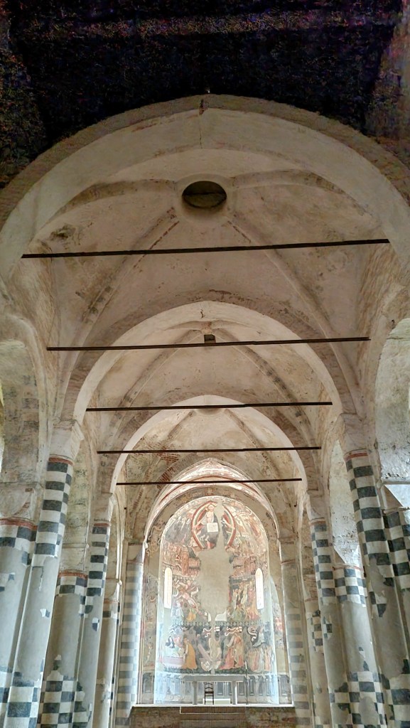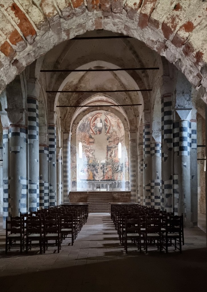 Austero l’esterno, più colorato l’interno, dalle colonne dipinte a fasce alternate bianche e nere, e le absidi tutte pregevolmente affrescate. E poi la cripta, ampia e dal pavimento mosaicato, sempre bianco e nero. Sublime.